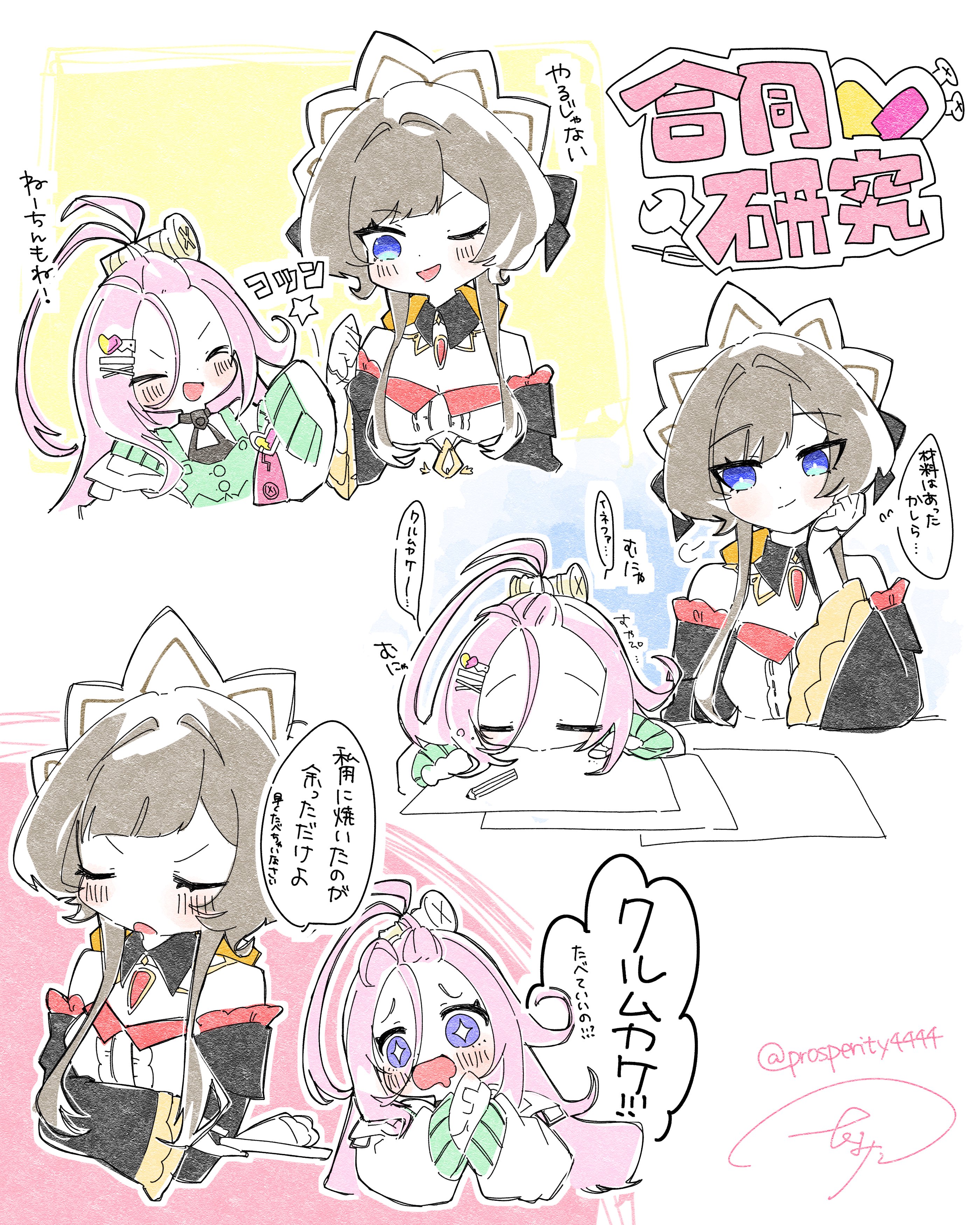 2girls absurdres ahoge aino_(genshin_impact) bangs_pinned_back bare_shoulders black_collar black_sleeves blue_eyes blush bonnet breasts brown_hair closed_eyes closed_mouth coat collar commentary_request detached_collar detached_sleeves dress elbow_rest forehead genshin_impact gloves green_dress hair_between_eyes hair_ornament hairclip halter_dress halterneck hand_on_own_head head_rest headdress highres huge_ahoge lakkaberry_krumkake_(genshin_impact) large_forehead long_hair long_sleeves multiple_girls one_eye_closed open_mouth own_hands_together paper pencil pink_hair prosperity4444 sandrone_(genshin_impact) screw screw_hair_ornament screwdriver short_hair_with_long_locks sleeves_past_fingers sleeves_past_wrists smile star_(symbol) translation_request very_long_hair white_coat wrench