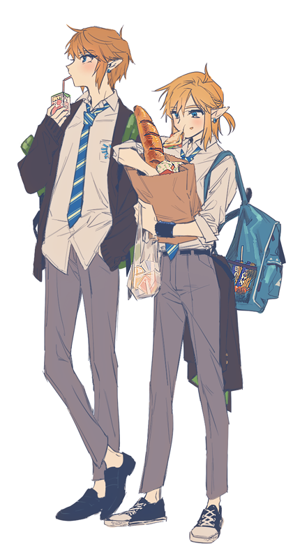 2boys backpack bag baguette bangoul black_shoes blonde_hair blue_eyes bread collared_shirt commentary_request diagonal-striped_clothes diagonal-striped_necktie drink_carton drinking_straw earrings food full_body grey_pants grocery_bag height_difference holding holding_bag jacket jewelry juice_box korean_commentary link male_focus multiple_boys necktie nintendo pants paper_bag plastic_bag pointy_ears shirt shirt_tucked_in shoes shopping_bag short_hair simple_background standing striped_clothes suit_jacket the_legend_of_zelda untucked_shirt white_background white_shirt white_shoes