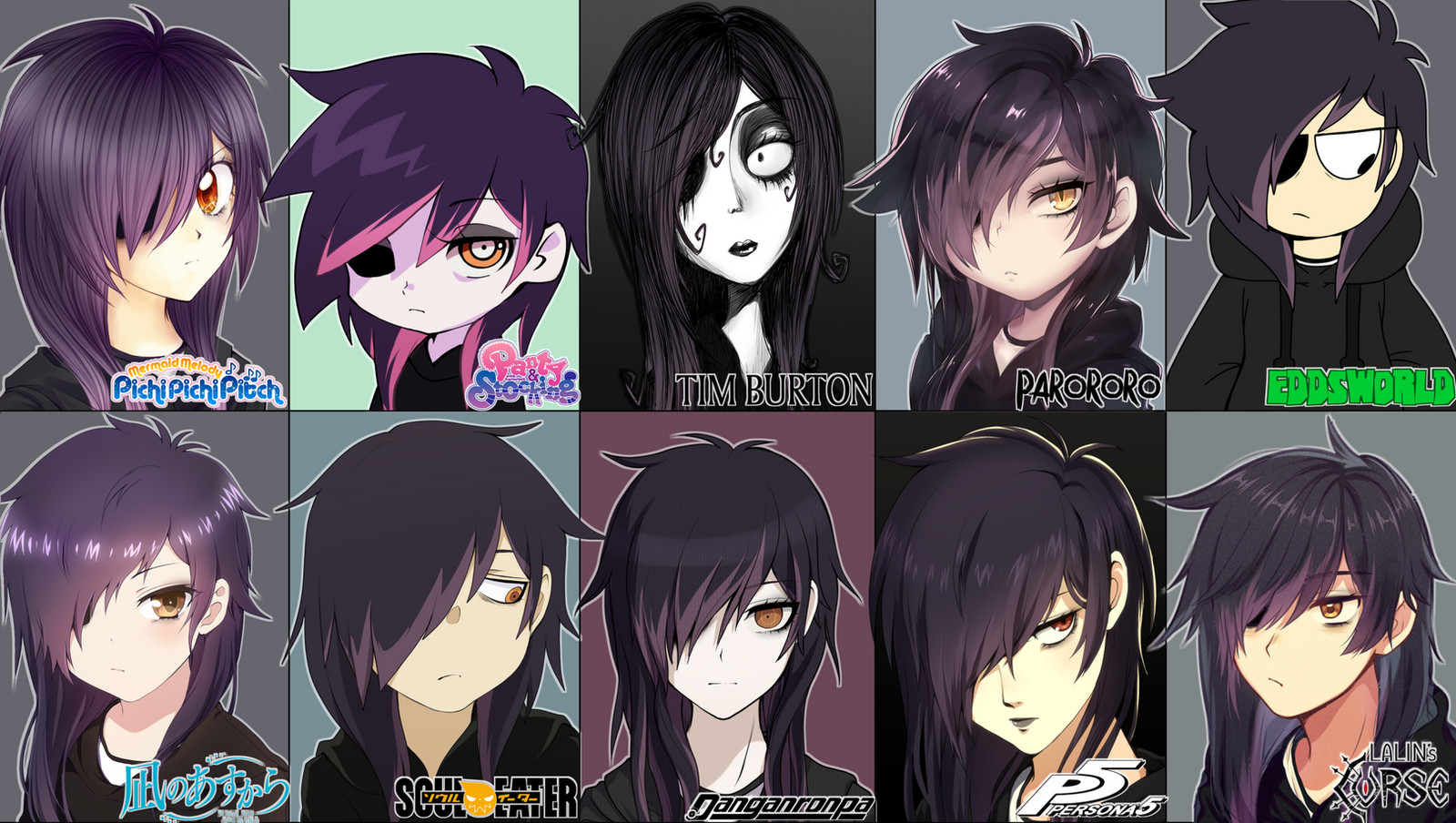 1girl 2000s_(style) bags_under_eyes black_hoodie commentary copyright_logo copyright_name danganronpa_(series) drawstring eddsworld emo_fashion english_commentary hair_over_one_eye highres hood hood_down hoodie lalin's_curse logo looking_at_viewer making-of_available medium_hair mermaid_melody_pichi_pichi_pitch missing_eye multicolored_hair multiple_drawing_challenge multiple_style_parody multiple_views nagi_no_asukara orange_eyes original panty_&_stocking_with_garterbelt panty_&_stocking_with_garterbelt_(style) parody parororo_(style) paul_ter_voorde_(style) persona persona_5 pink_hair purple_hair rimapichi scene_cut slit_pupils soul_eater streaked_hair style_parody tim_burton_(style) toon_(style) yellow_eyes