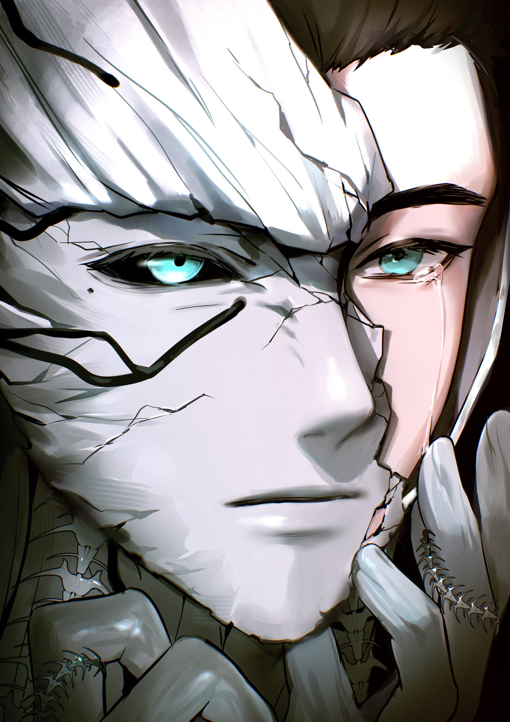 absurdres aqua_eyes black_hair black_sclera broken_helmet broken_mask broken_skin close-up colored_sclera crack cracked_helmet cracked_kawaii_mask cracked_mask cracked_skin hand_on_own_face highres mask masked millions_knives mismatched_eyes mole mole_under_eye portrait raku7560 revealing_layer split_theme tears trigun trigun_stampede
