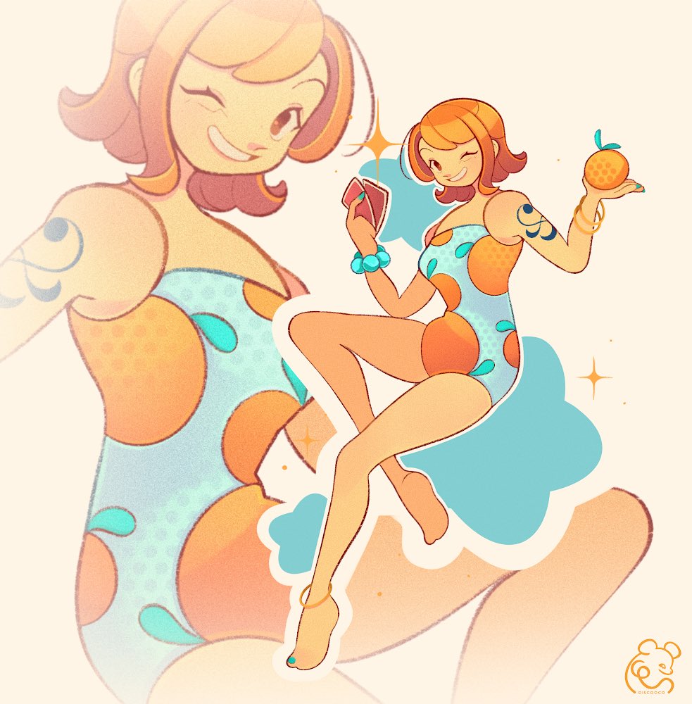 1girl alternate_costume anklet bangle bare_legs bare_shoulders barefoot bracelet commentary discooco english_commentary food food_print fruit fruit_print full_body holding holding_food holding_fruit jewelry legs looking_at_viewer mandarin_orange nail_polish nami_(one_piece) one-piece_swimsuit one_eye_closed one_piece orange_hair print_one-piece_swimsuit short_hair shoulder_tattoo signature solo sparkle swimsuit tattoo