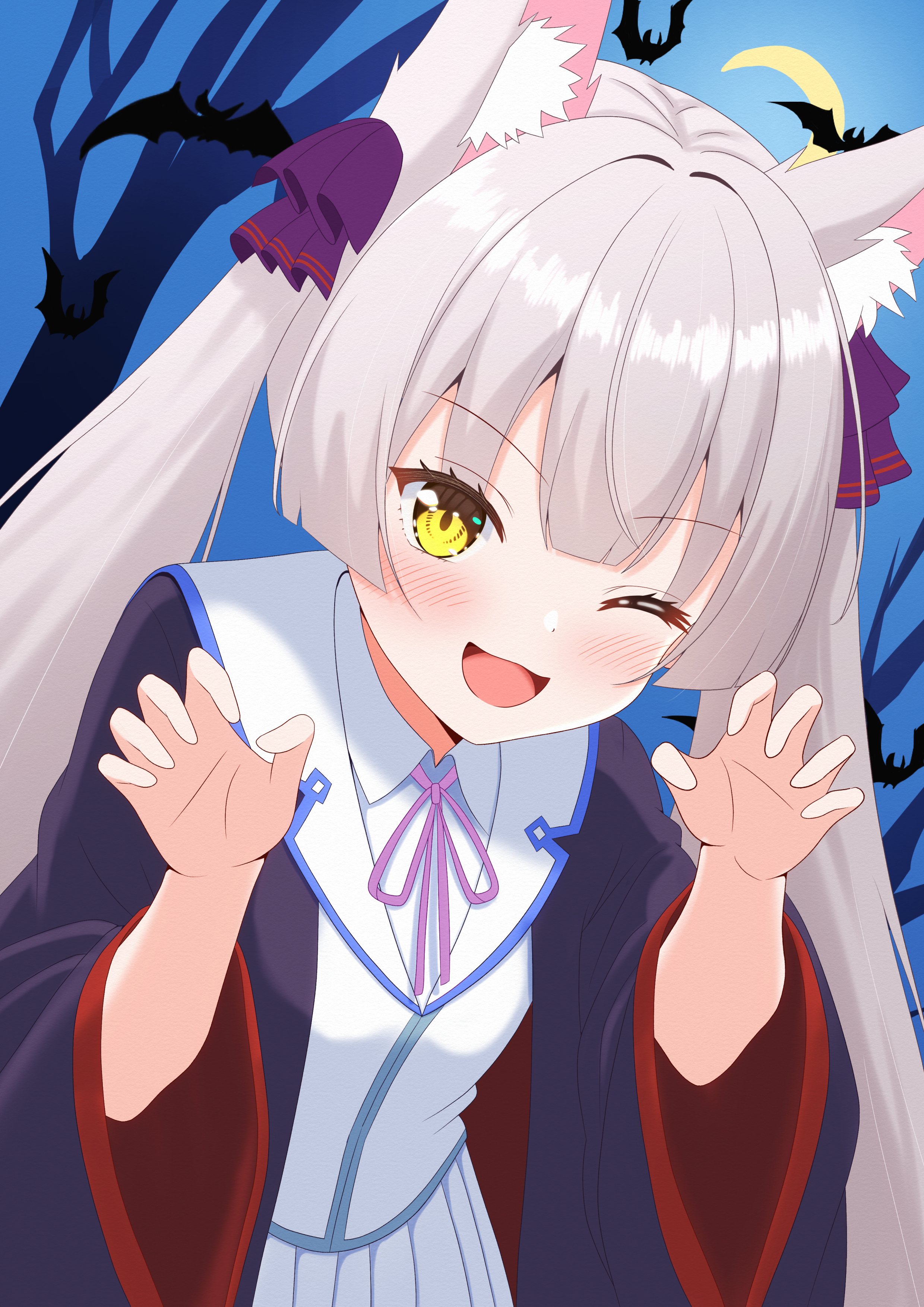 1girl absurdres animal_ear_fluff animal_ears bare_tree bat_(animal) black_robe blunt_bangs blunt_ends claw_pose collared_shirt cowboy_shot crescent_moon dutch_angle eyelashes grey_hair hair_ribbon halloween hands_up happy heaven_burns_red highres hime_cut kemonomimi_mode long_hair long_sleeves looking_at_viewer luck_hebuban moon neck_ribbon night ogasahara_hisame open_clothes open_robe outdoors pleated_skirt purple_ribbon ribbon robe shirt sidelocks skirt solo straight_hair tree twintails v-shaped_eyebrows very_long_hair white_shirt white_skirt wide_sleeves wolf_ears wolf_girl yellow_eyes