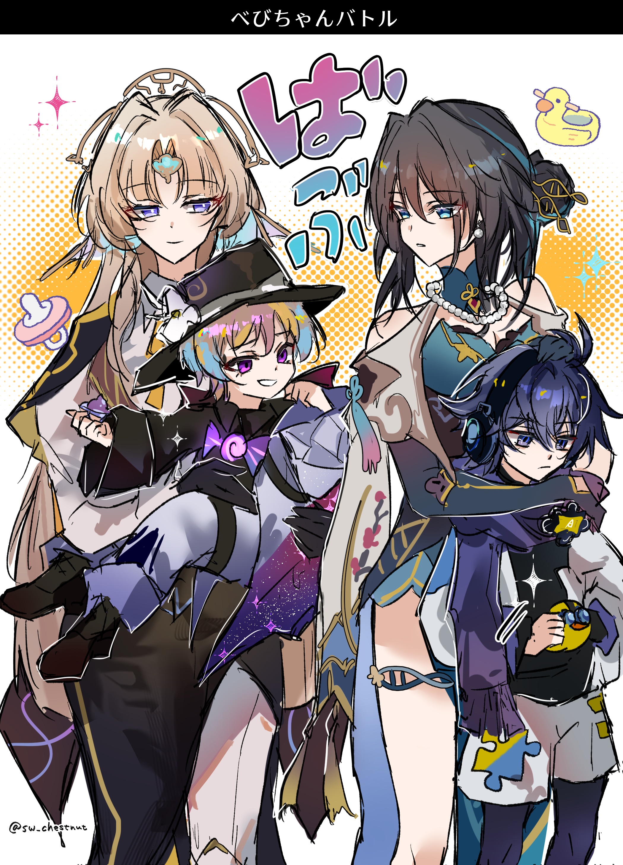 2boys 2girls absurdres antenna_hair aqua_eyes badge bead_necklace beads black_hair blonde_hair blue_eyes blue_hair collar commentary_request fedora fins grin hair_between_eyes hair_ornament hairpin hat head_fins headphones headpiece highres holding honkai:_star_rail honkai_(series) jewelry long_hair looking_at_another multicolored_hair multiple_boys multiple_girls necklace opal_(honkai:_star_rail) pants parted_bangs pearl_(honkai:_star_rail) pink_eyes purple_eyes ruan_mei_(honkai:_star_rail) shoes short_hair smile stephen_lloyd_(honkai:_star_rail) streaked_hair sw_chestnut translation_request twitter_username
