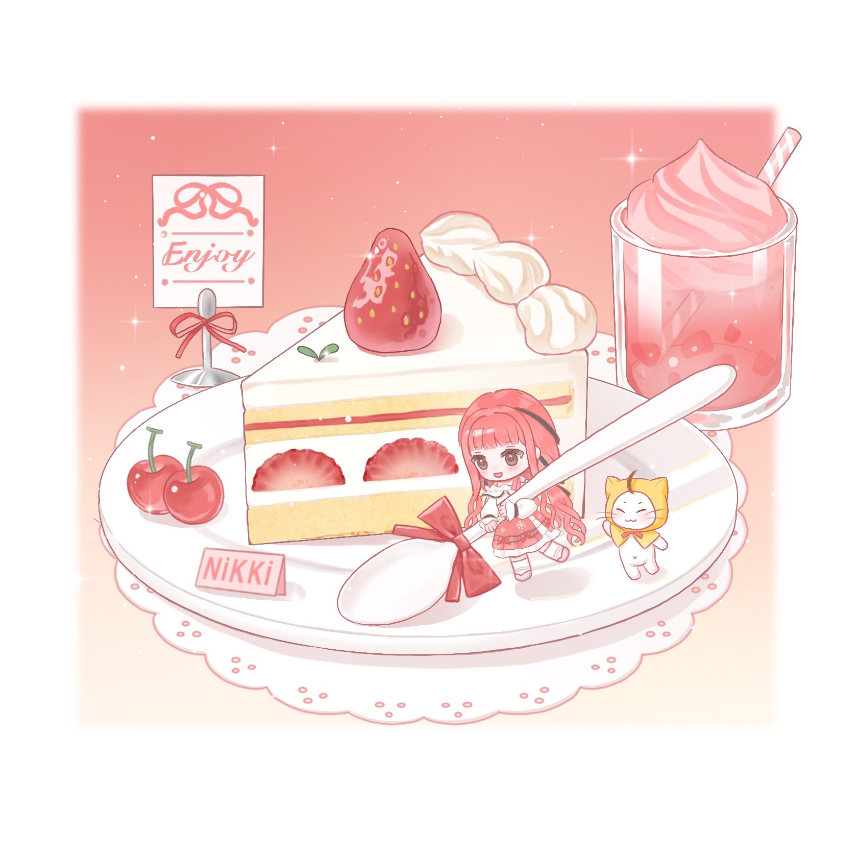 1girl ahoge animal black_bow black_ribbon blunt_bangs border bow bowtie brown_eyes cake cake_slice cat character_name cherry chibi chinese_commentary chunyuyuyuyu cloak clothed_animal commentary_request cup drinking_glass drinking_straw ear_covers food frilled_shirt frilled_skirt frilled_sleeves frills fruit gradient_background hair_bow hair_ribbon happy highres holding holding_spoon hood hood_up hooded_cloak infinity_nikki kneehighs layered_skirt leg_up long_hair long_sidelocks long_sleeves looking_ahead low_twintails mary_janes medium_skirt momo_(nikki) nikki_(nikki) nikki_(series) off-shoulder_shirt off_shoulder oversized_food oversized_object perfect_start_(infinity_nikki) pink_background pink_hair pink_shoes pink_skirt plate print_skirt procreate_(medium) puffy_long_sleeves puffy_sleeves red_bow red_bowtie ribbon shirt shoes sidelocks skirt sleeves_past_wrists snowflake_print socks spoon strawberry_juice strawberry_shortcake traditional_bowtie tress_ribbon twintails two-tone_background very_long_hair wavy_hair whiskers white_border white_cat white_shirt white_skirt white_socks yellow_background yellow_cloak