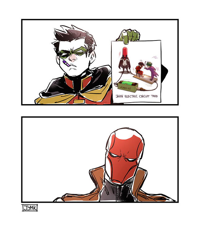 batman_(series) belt black_bodysuit black_gloves black_hair bodysuit cape commentary crowbar damian_wayne dc_comics english_commentary eye_mask formal_clothes gloves green_hair holding jacket jason_todd jjmk-jjmk male_focus mask multiple_boys pants red_hood robin_(dc) shirt short_hair suit the_joker