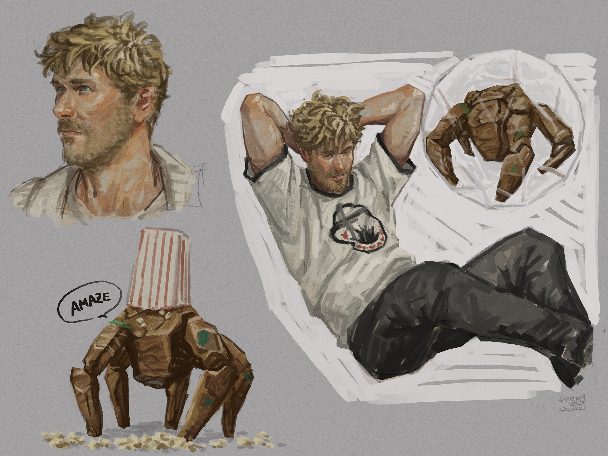 1boy alien beard beard_stubble blonde_hair casual commentary_request facial_hair highres male_focus messy_hair project_hail_mary rocky_(project_hail_mary) ryland_grace shirt ssns_dot stubble white_shirt
