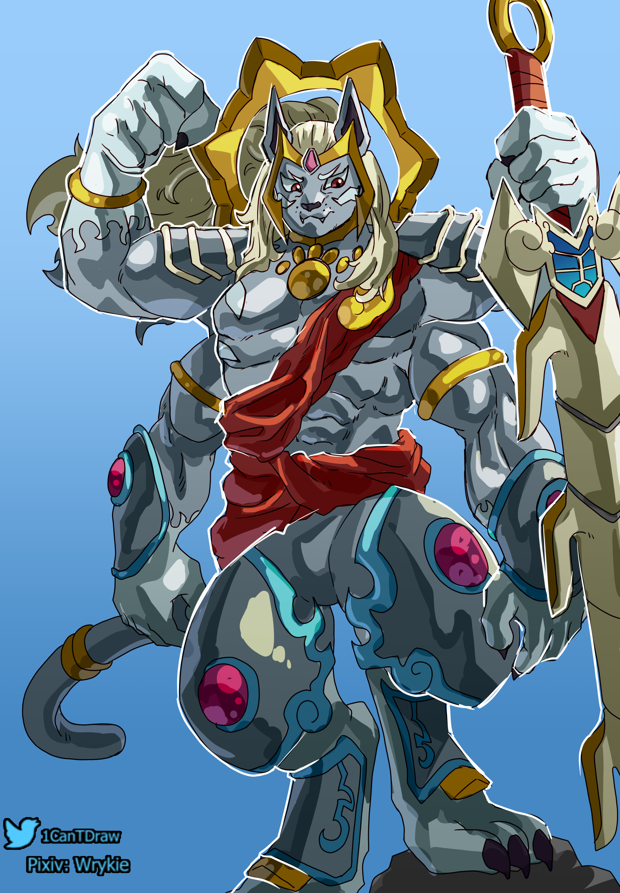 1cantdraw armor digimon digimon_(creature) furry furry_male habakirimon muscular muscular_male red_eyes sword tail weapon