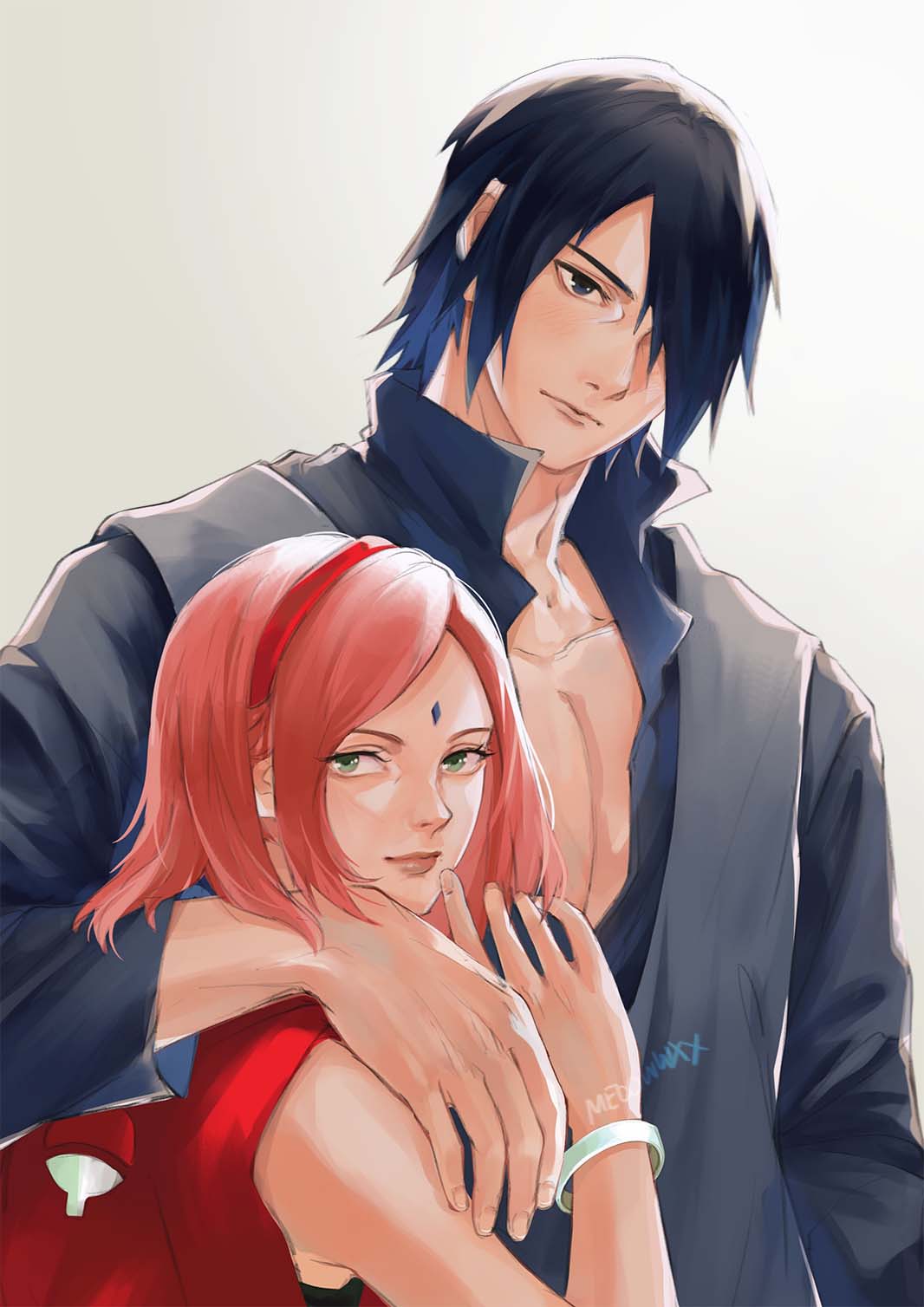 1boy 1girl arm_around_neck artist_name black_hair black_robe black_shirt boruto:_naruto_next_generations bracelet closed_mouth collared_shirt commentary couple facial_mark forehead_mark green_eyes grey_eyes hair_over_one_eye hairband hand_to_own_mouth haruno_sakura hetero highres jewelry meoowwxx naruto_(series) parted_bangs pink_hair red_hairband red_shirt robe shirt short_hair uchiha_sasuke untranslatable_commentary upper_body white_background