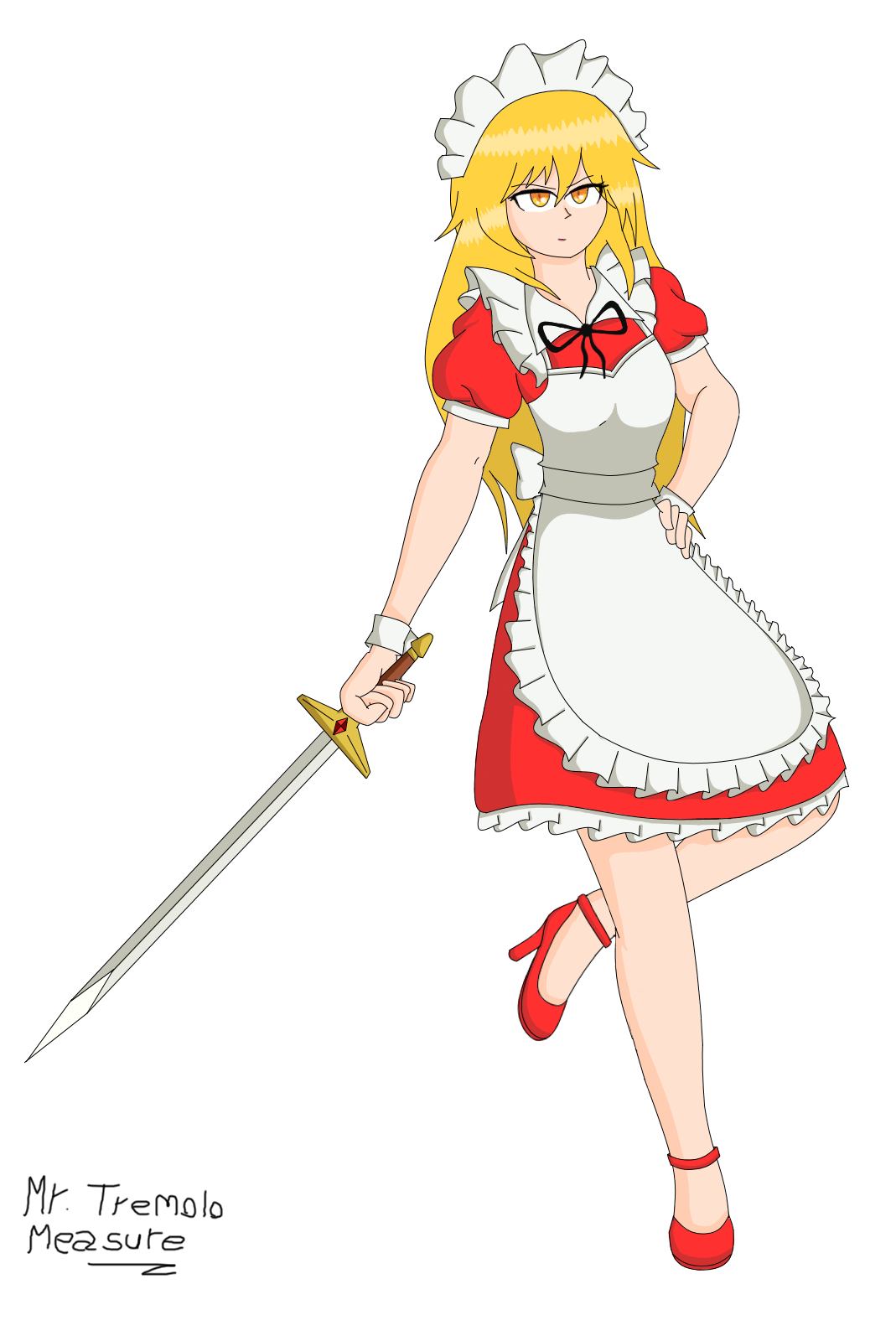1girl apron blonde_hair dress expressionless frills hair_ornament highres holding holding_sword holding_weapon long_hair maid maid_headdress mrtremolomeasure puffy_short_sleeves puffy_sleeves red_dress red_shoes ribbon shoes short_sleeves solo sword thighhighs touhou touhou_(pc-98) transparent_background weapon yellow_eyes yumeko_(touhou)