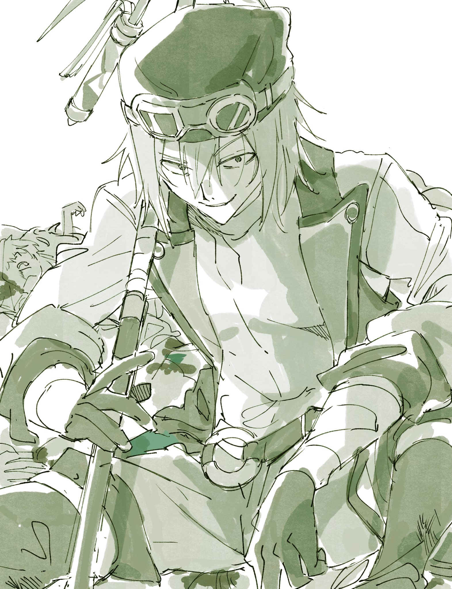 1boy bandana gloves goggles goggles_on_head hair_between_eyes highres holding holding_polearm holding_weapon male_focus monochrome polearm short_hair sitting smile solo sweater toramaru_(696anna) tsav_(yuushakei_ni_shosu) turtleneck turtleneck_sweater weapon white_background yuushakei_ni_shosu