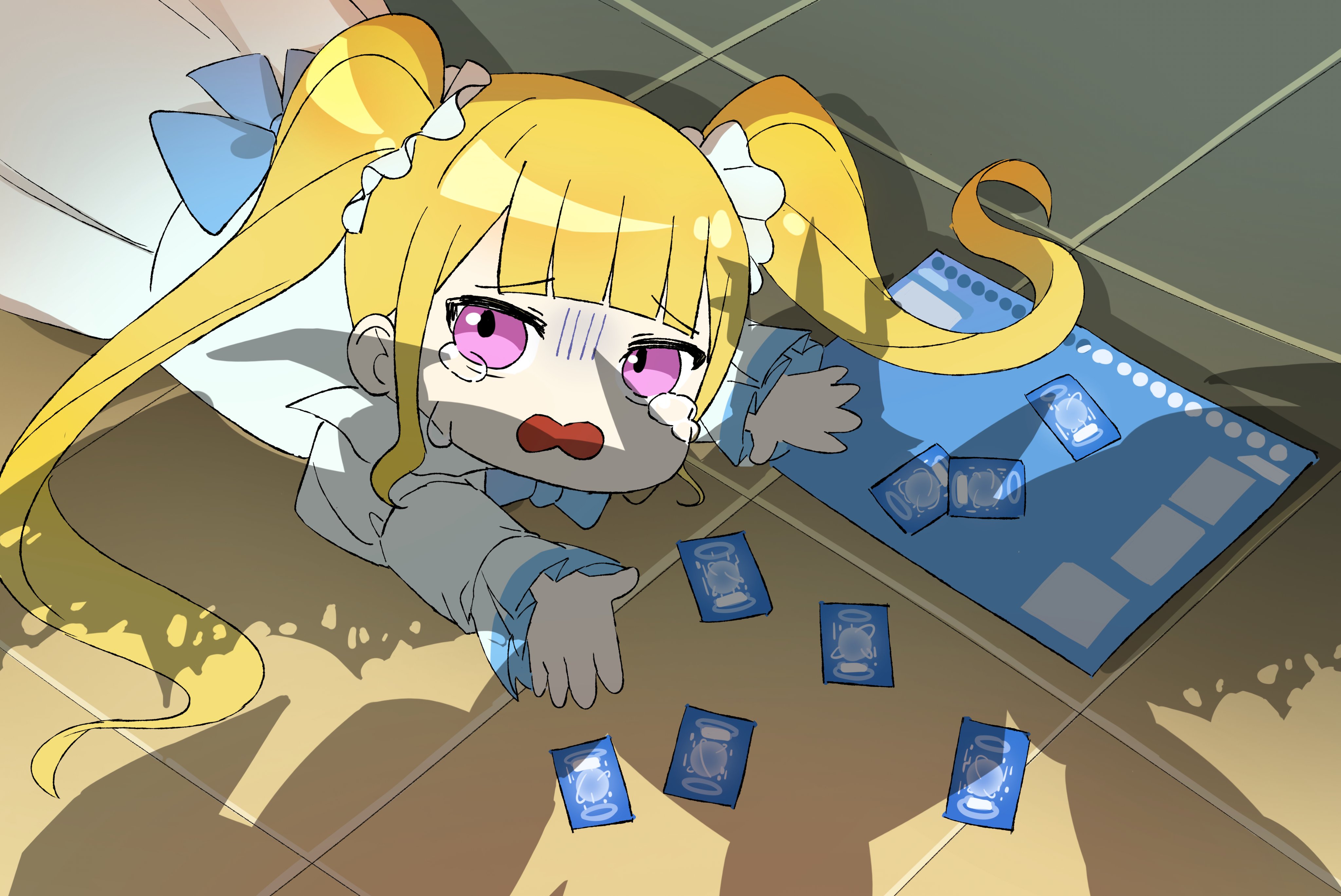 1boy 1girl apu_spills_his_tendies_(meme) blonde_hair digimon digimon_(creature) digimon_card_game digimon_story:_time_stranger gameplay_mechanics imperialdramon imperialdramon_fighter_mode_(black) looking_at_another looking_at_viewer lying meme on_stomach pink_hair shadow yggdrasill_(digimon) yggdrasill_(digimon)_(human_avatar)