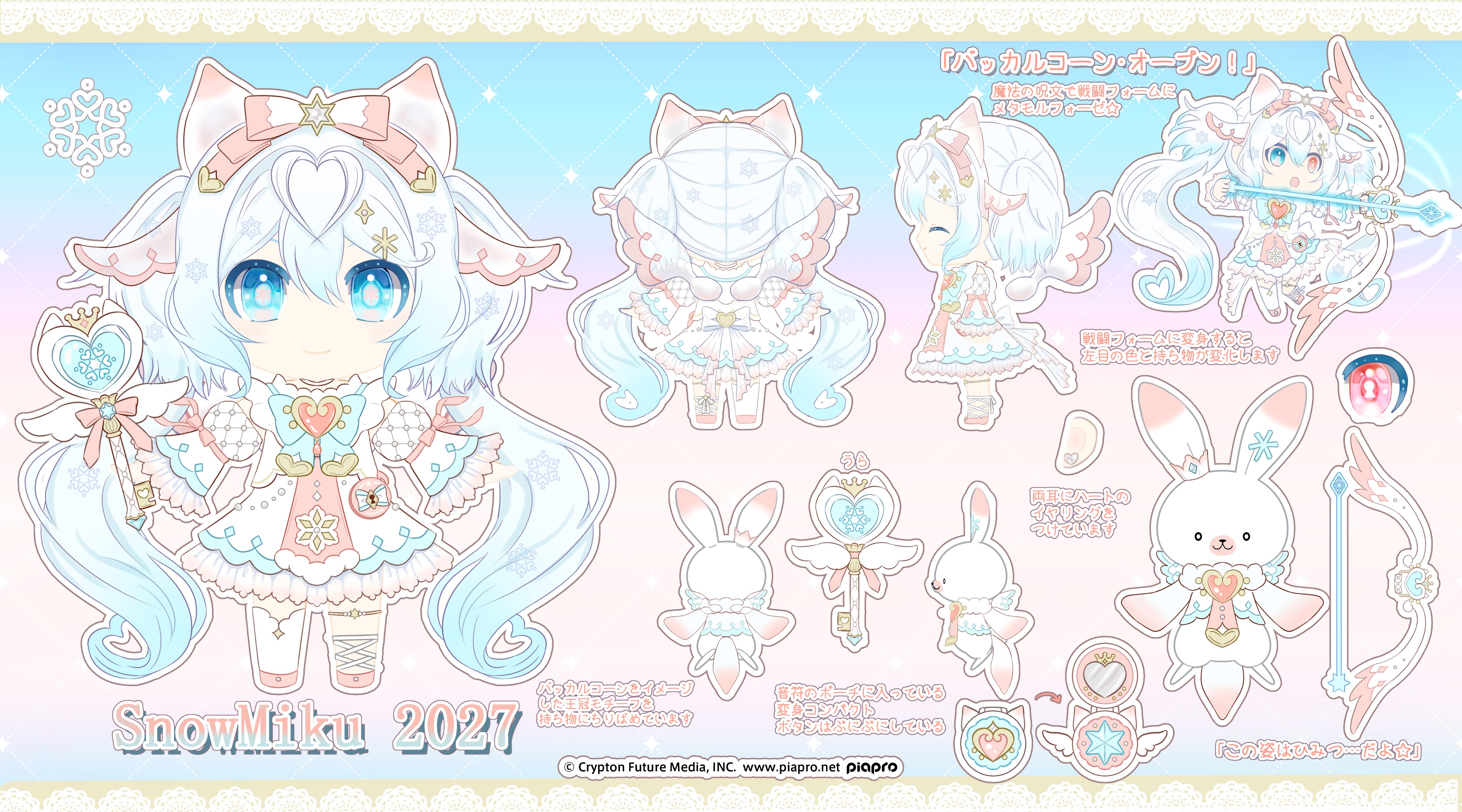 1girl absurdres arrow_(projectile) blue_eyes blue_hair bow_(weapon) commentary_request dress gradient_hair hair_between_eyes hair_ornament hatsune_miku heart highres holding holding_bow_(weapon) holding_wand holding_weapon momoka-a multicolored_hair multiple_views pink_shoes rabbit_yukine reference_sheet shoes single_thighhigh snowflake_hair_ornament thighhighs translation_request turnaround vocaloid wand weapon white_dress white_hair white_thighhighs yuki_miku yuki_miku_(2027)_(applicant)