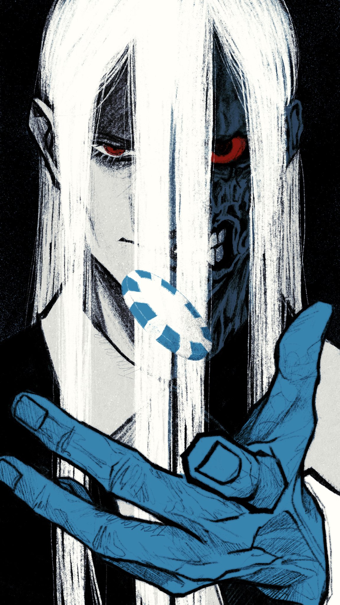 1boy absolute_batman absolute_dc black_background collared_shirt colored_sclera commentary dc_comics english_commentary hair_between_eyes harvey_dent highres jacket long_hair looking_at_viewer male_focus multicolored_jacket poker_chip portrait red_eyes red_sclera shirt solo trarana0328 two-face two-face_(absolute_dc) two-tone_jacket two-tone_shirt white_hair
