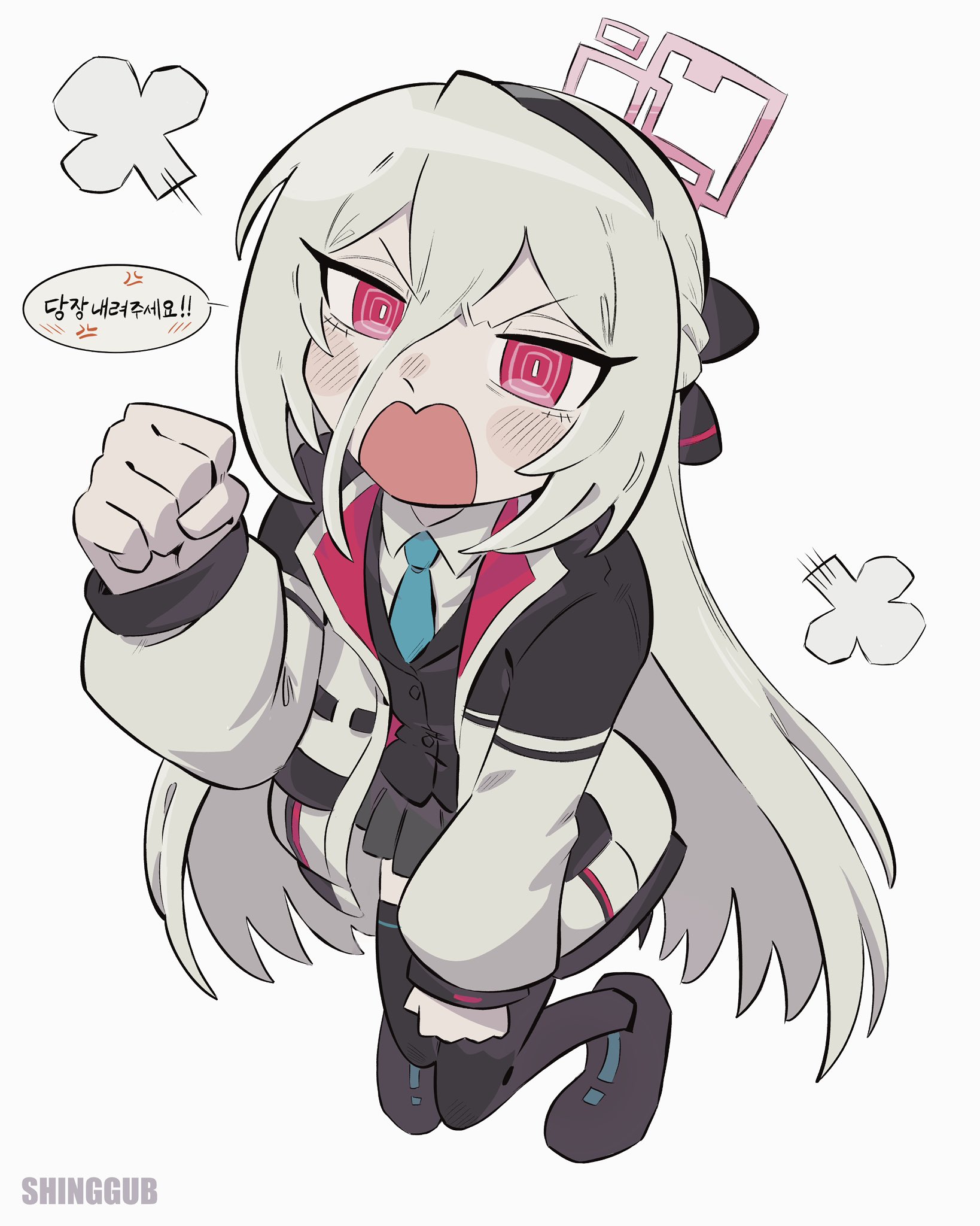 1girl anger_vein angry black_headband black_thighhighs blue_archive blue_necktie clenched_hand collared_shirt commentary_request hair_between_eyes halo headband highres jacket kei_(blue_archive) kei_(new_body)_(blue_archive) korean_commentary necktie pink_eyes pink_halo pleated_skirt rectangular_halo ringed_eyes s2h331 shirt skirt solo thighhighs white_background white_hair white_shirt