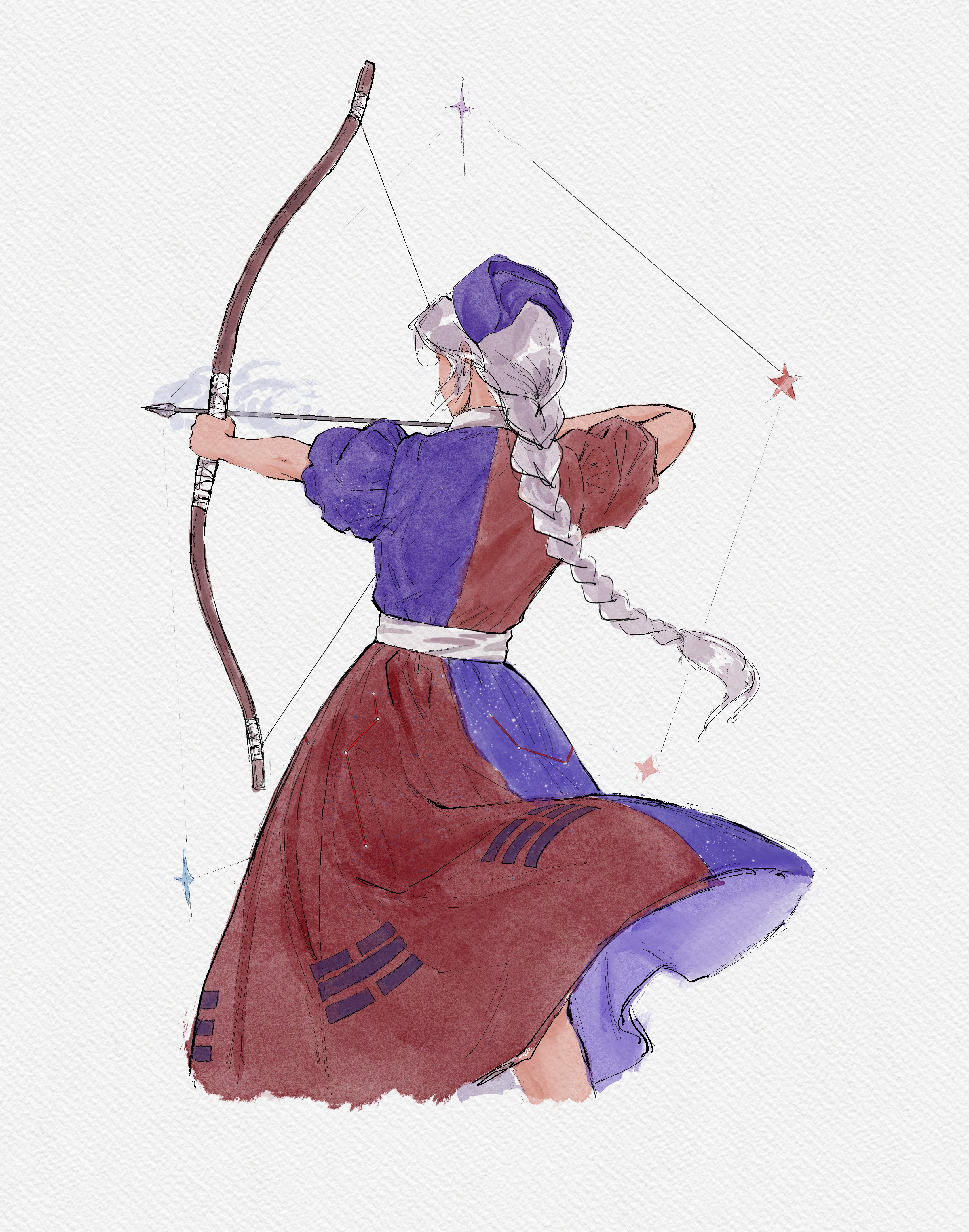 1girl absurdres arrow_(projectile) blue_dress blue_hat bow_(weapon) braid chinese_commentary commentary_request constellation constellation_print cropped_legs drawing_bow dress from_behind grey_hair hat highres holding holding_arrow holding_bow_(weapon) holding_weapon long_braid long_hair outstretched_arm puffy_short_sleeves puffy_sleeves red_dress sash short_sleeves simple_background solo touhou two-tone_dress waist_sash weapon white_background xinjinjumin6256801 yagokoro_eirin