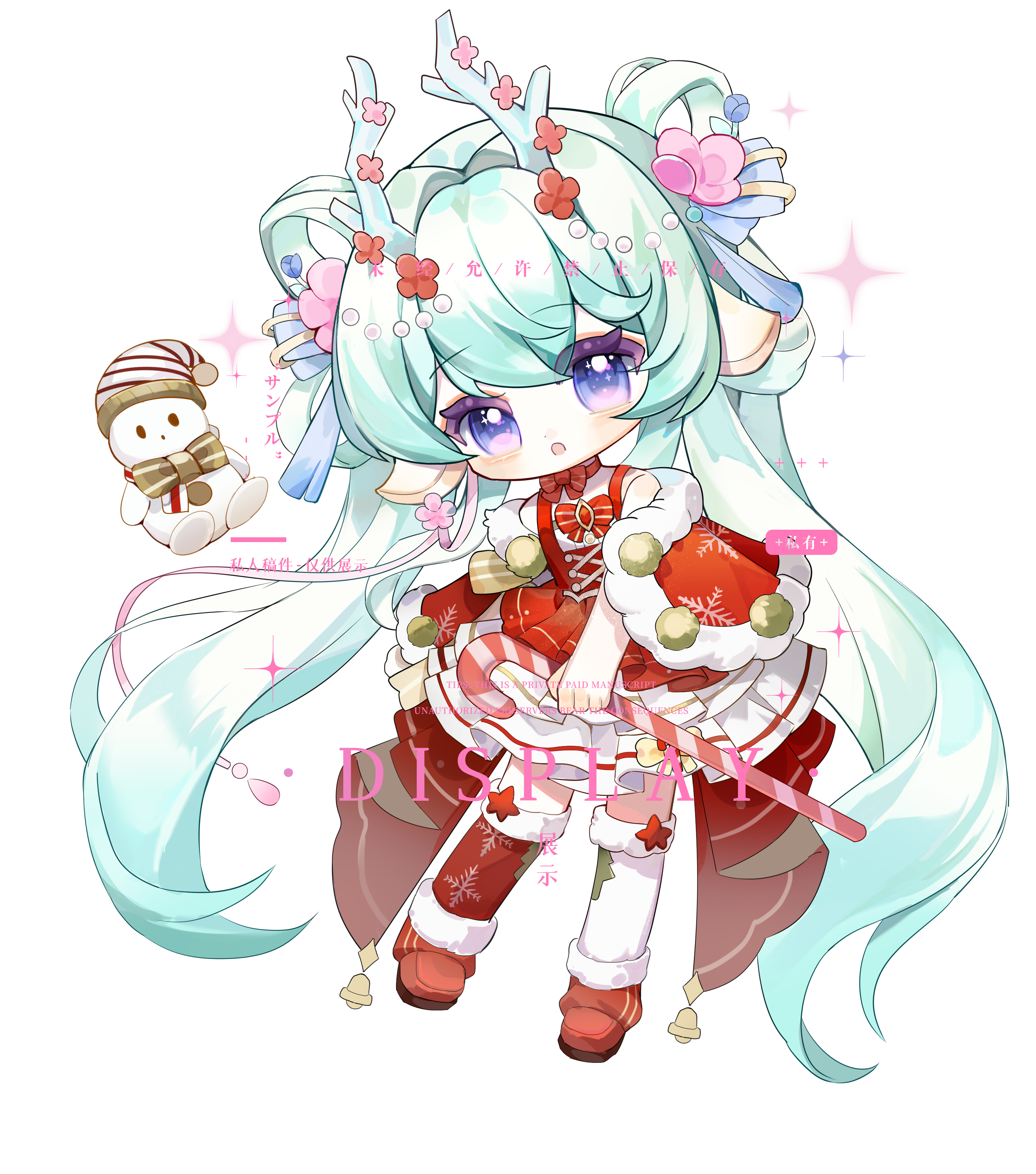 1girl absurdres animal_ears antlers boots candy candy_cane capelet chibi chibi_only christmas deer_ears dress flower food full_body fur-trimmed_boots fur-trimmed_capelet fur_trim green_hair hair_flower hair_ornament highres holding holding_food horns long_hair looking_at_viewer open_mouth original purple_eyes red_dress simple_background snowman solo thighhighs twintails very_long_hair watermark white_background white_thighhighs zhishuire