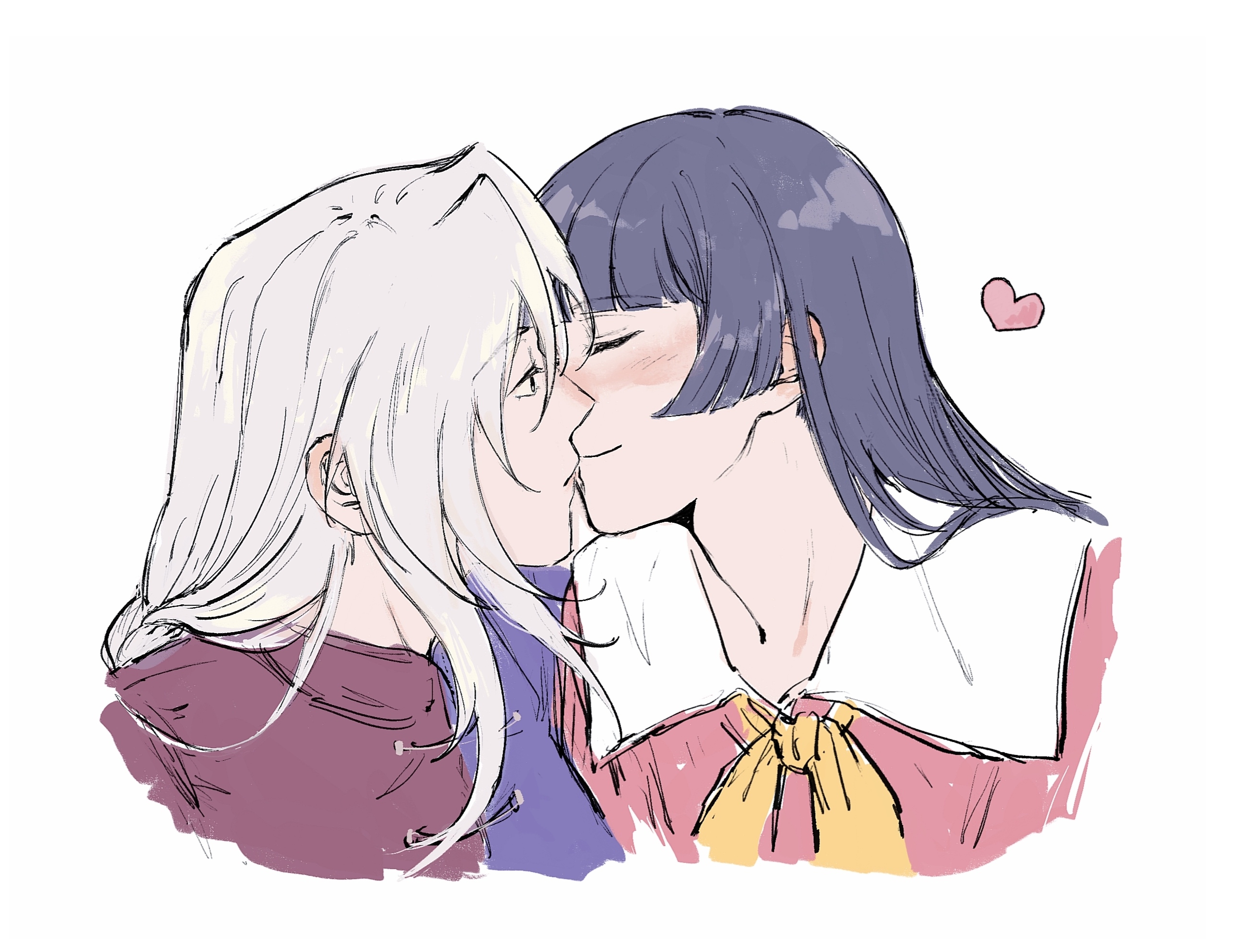 2girls black_hair blue_dress blunt_bangs blush bow bowtie chinese_commentary closed_eyes closed_mouth commentary_request cropped_shoulders dress heart highres hime_cut houraisan_kaguya kiss long_hair missing_headwear multiple_girls pink_shirt profile red_dress shirt simple_background smile touhou two-tone_dress white_background white_hair xinjinjumin6256801 yagokoro_eirin yellow_bow yellow_bowtie yuri