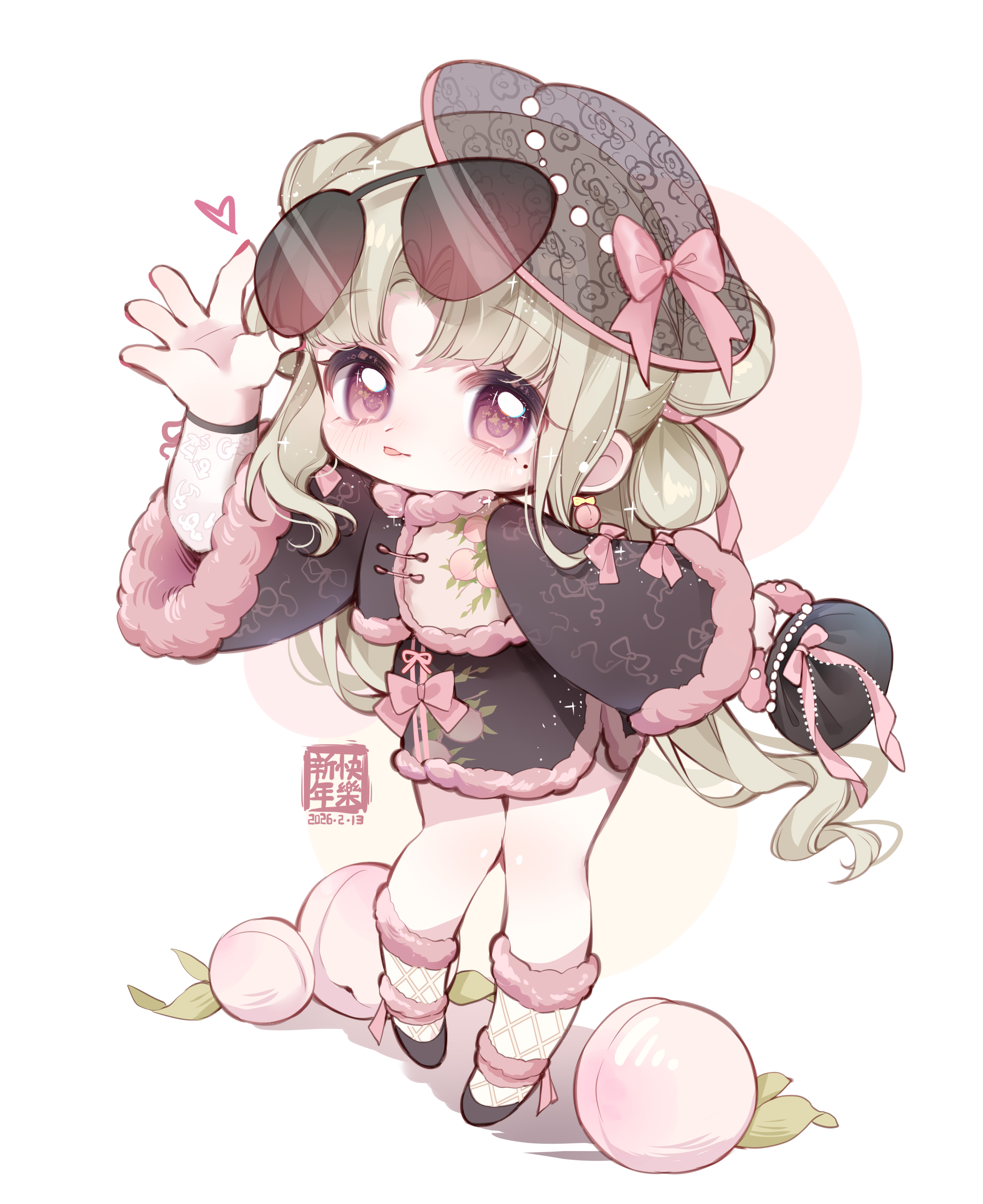 1girl absurdres arm_up bag blush bow chibi chibi_only chinese_clothes chinese_commentary commentary_request double_bun dress earrings eyewear_on_head food fruit full_body fur-trimmed_sleeves fur_trim hair_bun handbag hat heart highres holding jewelry long_hair long_sleeves looking_at_viewer mole mole_under_eye nuli_de_chengzhi_er original peach pink_bow round_eyewear simple_background skirt socks solo standing sunglasses tongue tongue_out very_long_hair white_background white_socks wide_sleeves