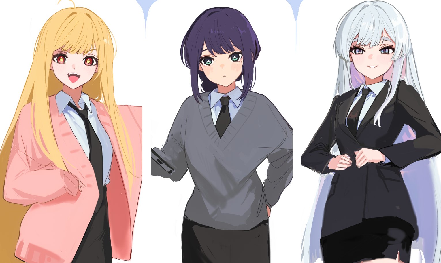 3girls ahoge black_hair black_necktie black_skirt blonde_hair blue_eyes cho_kaguya-hime! colored_inner_hair commentary_request cowboy_shot fangs green_eyes grin hixii1238 kaguya_(cho_kaguya-hime!) korean_commentary long_sleeves looking_at_viewer mole mole_under_eye multicolored_eyes multicolored_hair multiple_girls necktie open_mouth pink_eyes pink_hair red_eyes runami_yachiyo sakayori_iroha skirt smile two-tone_hair white_background white_hair