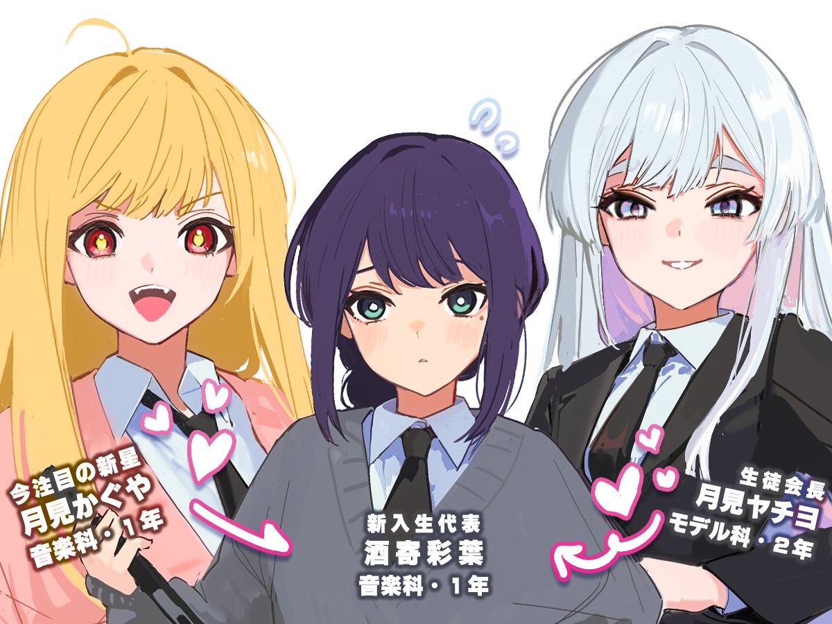 3girls ahoge arrow_(symbol) black_hair black_necktie blonde_hair blue_eyes cho_kaguya-hime! colored_inner_hair commentary_request fangs green_eyes grin heart hixii1238 kaguya_(cho_kaguya-hime!) looking_at_viewer mole mole_under_eye multicolored_eyes multicolored_hair multiple_girls necktie open_mouth pink_eyes pink_hair red_eyes runami_yachiyo sakayori_iroha smile translation_request two-tone_hair upper_body white_background white_hair