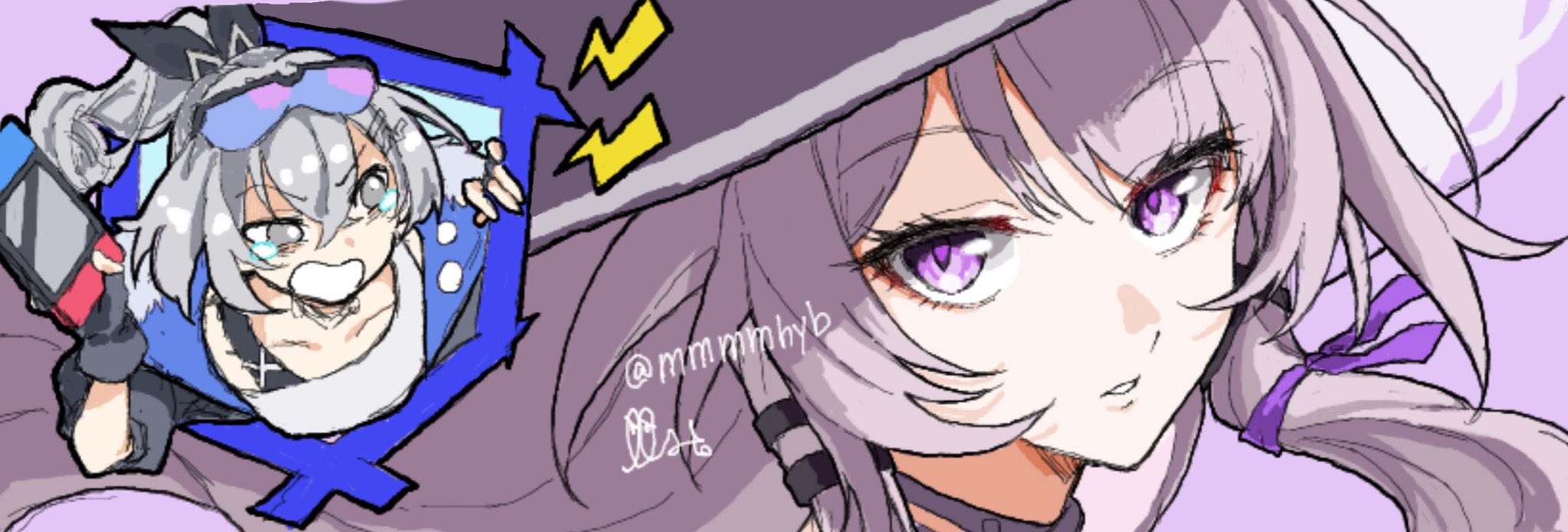 2girls artist_name collarbone commentary_request grey_eyes grey_hair hair_ribbon handheld_game_console hat herta_(honkai:_star_rail) highres holding holding_handheld_game_console honkai:_star_rail honkai_(series) mmmmhyb multiple_girls purple_ribbon ribbon silver_wolf_(honkai:_star_rail) tears the_herta_(honkai:_star_rail)