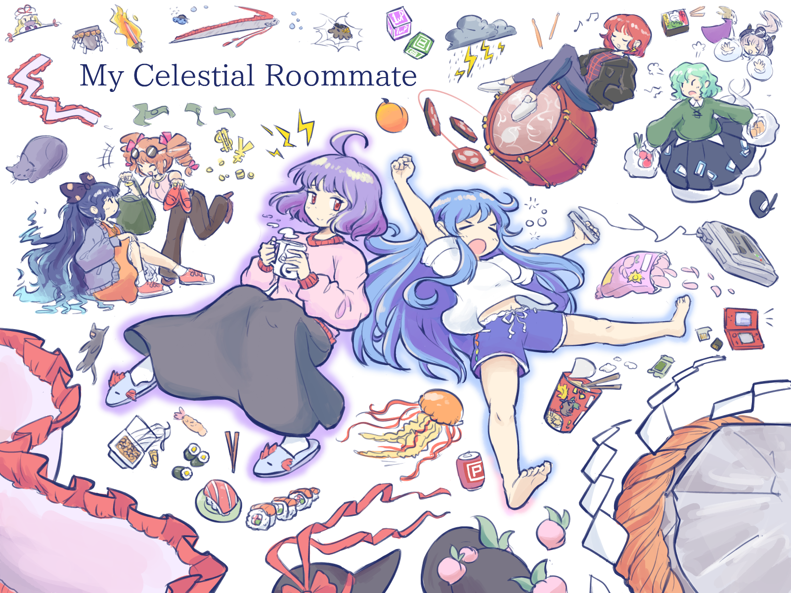 >_< +++ 1up 6+girls ahoge alternate_costume animal_slippers animalization bag banknote barefoot black_hat black_jacket black_skirt blue_bow blue_hair blue_shorts bomb_item_(touhou) bow brown_pants cape cardigan cat closed_eyes commentary contemporary controller crossed_legs dress drill_hair drum english_commentary english_text eyewear_on_head fish food fruit fruit_hat_ornament game_console game_controller gap_(touhou) ghost_tail green_hair green_sweater grey_cardigan hair_bow hat hat_bow hat_ornament hat_ribbon high_heels highres hinanawi_tenshi holding holding_bag holding_controller holding_game_controller holding_shoes holding_unworn_clothes horikawa_raiko instrument jacket kaname-ishi leaf_hat_ornament long_hair long_sleeves missing_headwear mob_cap money mononobe_no_futo multiple_girls nagae_iku nagae_iku_(fish) oarfish ofuda ofuda_on_clothes open_cardigan open_clothes open_jacket open_mouth orange_dress oysterfried pants peach peach_hat_ornament pink_sweater plaid_clothes plaid_shirt puff_of_air purple_cape purple_hair red_bow red_eyes ribbon round_eyewear shirt shoes shorts shrimp shrimp_tempura siblings sisters sitting sitting_on_drum skirt slippers smile soga_no_tojiko squeans stuffed_animal stuffed_cat stuffed_toy sunglasses sushi sweater sword_of_hisou taiko_drum tempura toes touhou toyosatomimi_no_miko twin_drills unworn_headwear unworn_shoes very_long_hair white_hat white_shirt yakumo_yukari yorigami_jo'on yorigami_shion