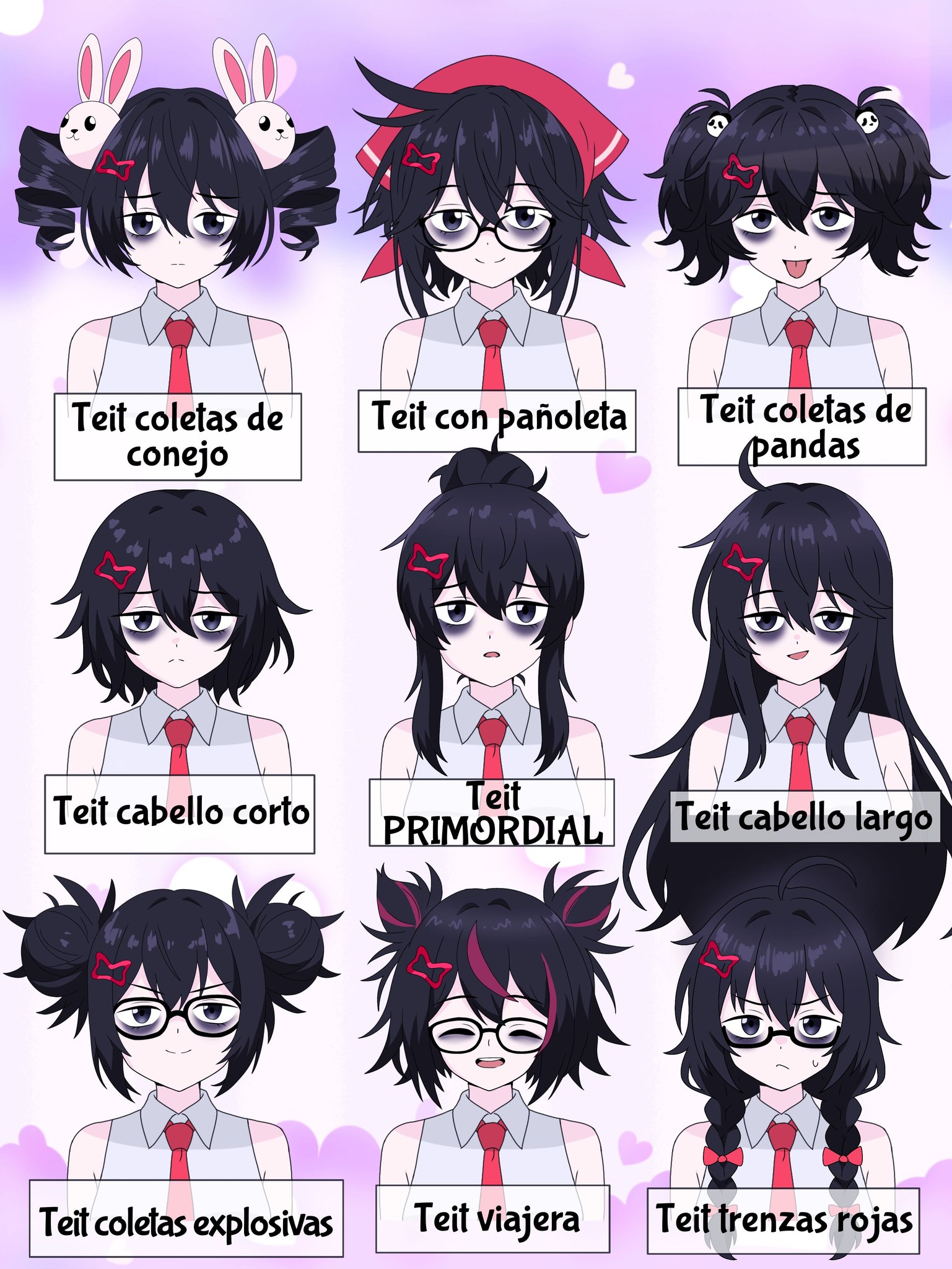 1girl :/ bags_under_eyes black_eyes black_hair bow braid closed_eyes commentary_request cone_hair_bun double_bun drill_hair frown glasses hair_bow hair_bun hair_ornament hairclip headscarf highres long_hair low_twin_braids multicolored_hair necktie open_mouth original purple_hair rabbit_hair_ornament red_necktie shirt short_hair single_hair_bun sleeveless sleeveless_shirt smile spanish_commentary spanish_text streaked_hair sweatdrop tate_alon teit_talon tongue tongue_out translation_request twin_braids twin_drills twintails two-tone_hair white_shirt