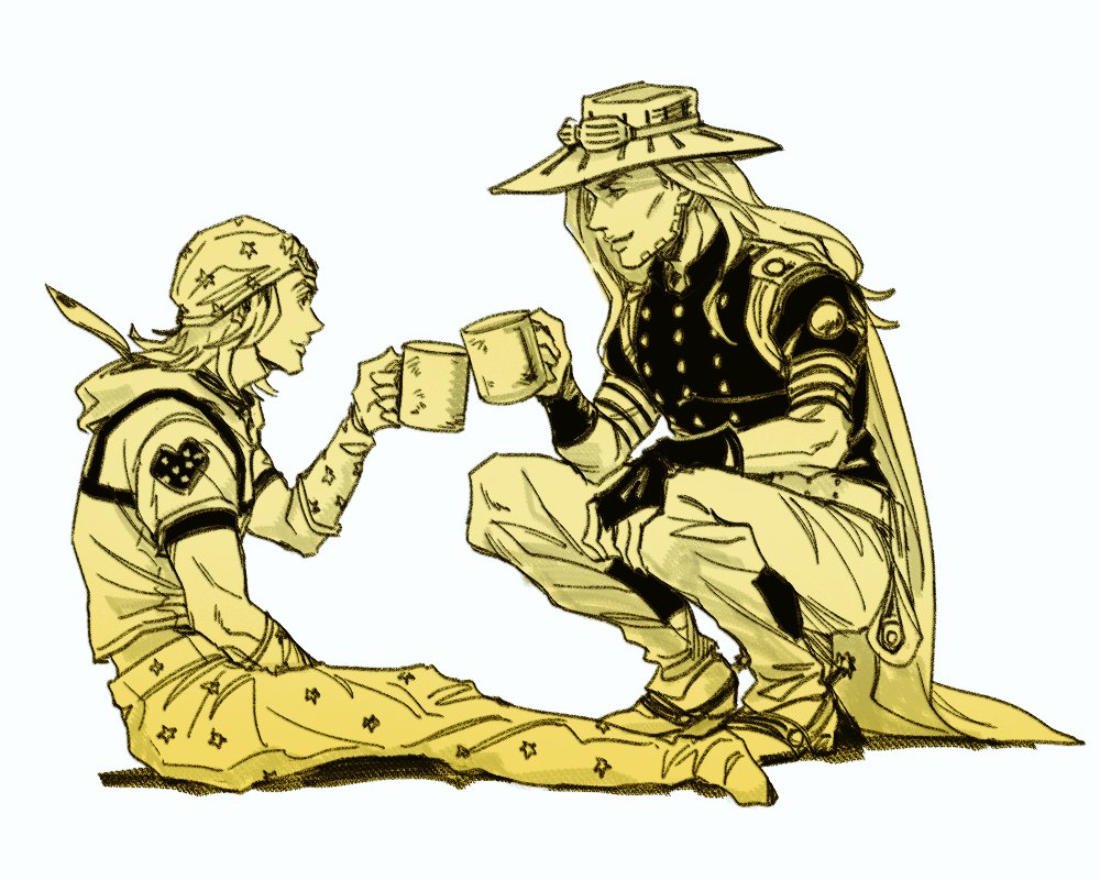 2boys commentary_request dixie_cup_hat ee2eewok gyro_zeppeli hat heart_ornament horse_print horseshoe horseshoe_hat_ornament horseshoe_ornament johnny_joestar jojo_no_kimyou_na_bouken korean_commentary military_hat multiple_boys star_(symbol) star_print steel_ball_(jojo) steel_ball_run