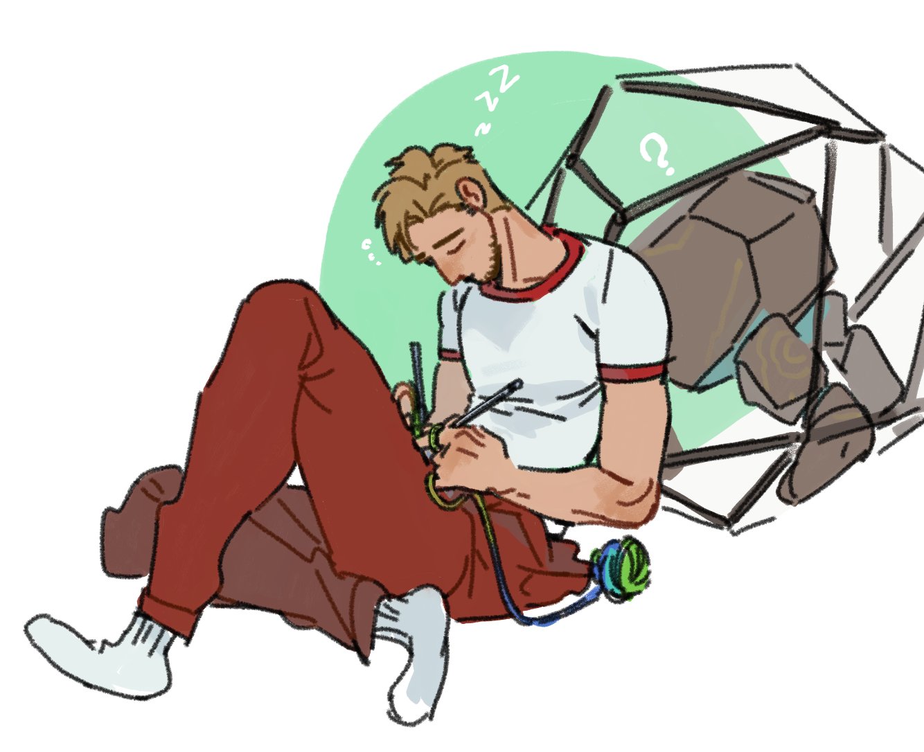 1boy alien beard beard_stubble blonde_hair casual commentary facial_hair male_focus mcbuckwheat messy_hair project_hail_mary rocky_(project_hail_mary) ryland_grace shirt stubble untranslatable_commentary white_shirt