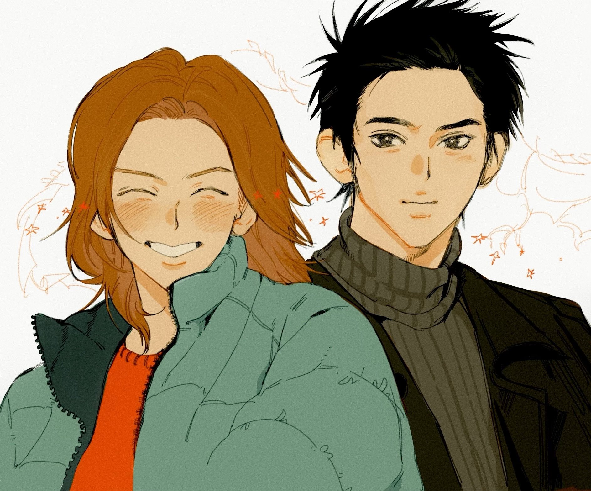 2boys akiyama_ren animification black_eyes black_hair black_jacket brown_hair clenched_teeth closed_eyes closed_mouth curtained_hair facing_viewer grey_shirt highres jacket kamen_rider kamen_rider_ryuki_(series) kido_shinji layered_clothes looking_at_viewer mada_nyuushi male_focus medium_hair multiple_boys open_clothes open_jacket red_shirt ribbed_shirt shirt short_hair smile teeth turtleneck upper_body