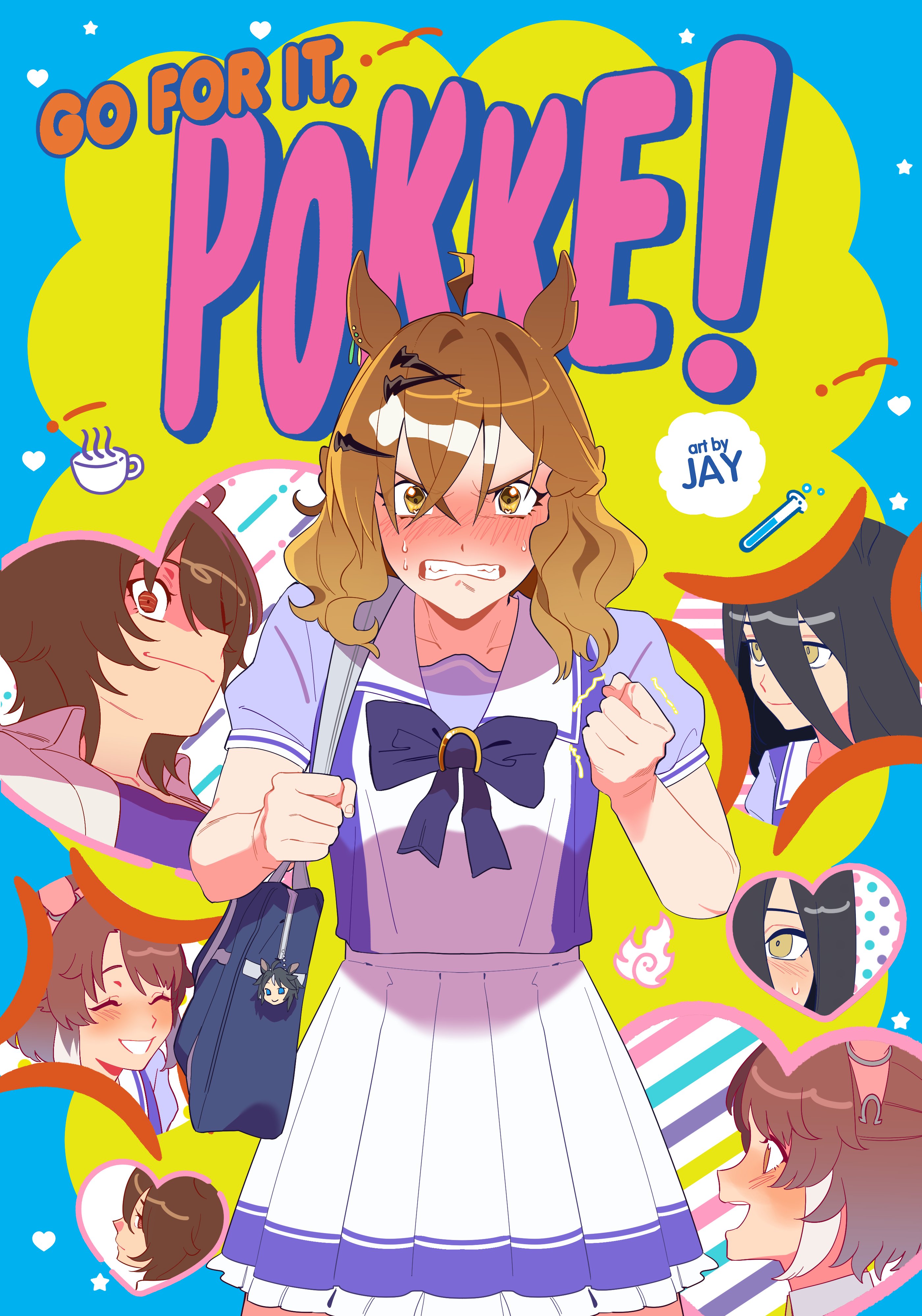 4girls ^_^ absurdres agnes_tachyon_(umamusume) animal_ears bag black_hair blush bow bowtie brown_hair chocoyanstickz clenched_hands clenched_teeth closed_eyes closed_mouth commentary cover cover_page cup dantsu_flame_(umamusume) ear_covers english_commentary english_text eyebrows_hidden_by_hair fake_cover fuji_kiseki_(umamusume) ganbare!_nakamura-kun!!_cover_parody hair_between_eyes hair_ornament heart heart_frame heart_in_eye highres horse_ears jungle_pocket_(umamusume) light_smile long_hair looking_ahead looking_at_viewer manhattan_cafe_(umamusume) medium_hair multicolored_hair multiple_girls multiple_views nose_blush open_mouth parody partially_shaded_face red_eyes school_uniform shirt shirt_tucked_in short_sleeves shoulder_bag skirt smile standing star_(symbol) straight-on sweat symbol_in_eye teeth test_tube title_parody tracen_school_uniform trembling two-tone_hair umamusume v-shaped_eyebrows white_hair yellow_eyes yuri