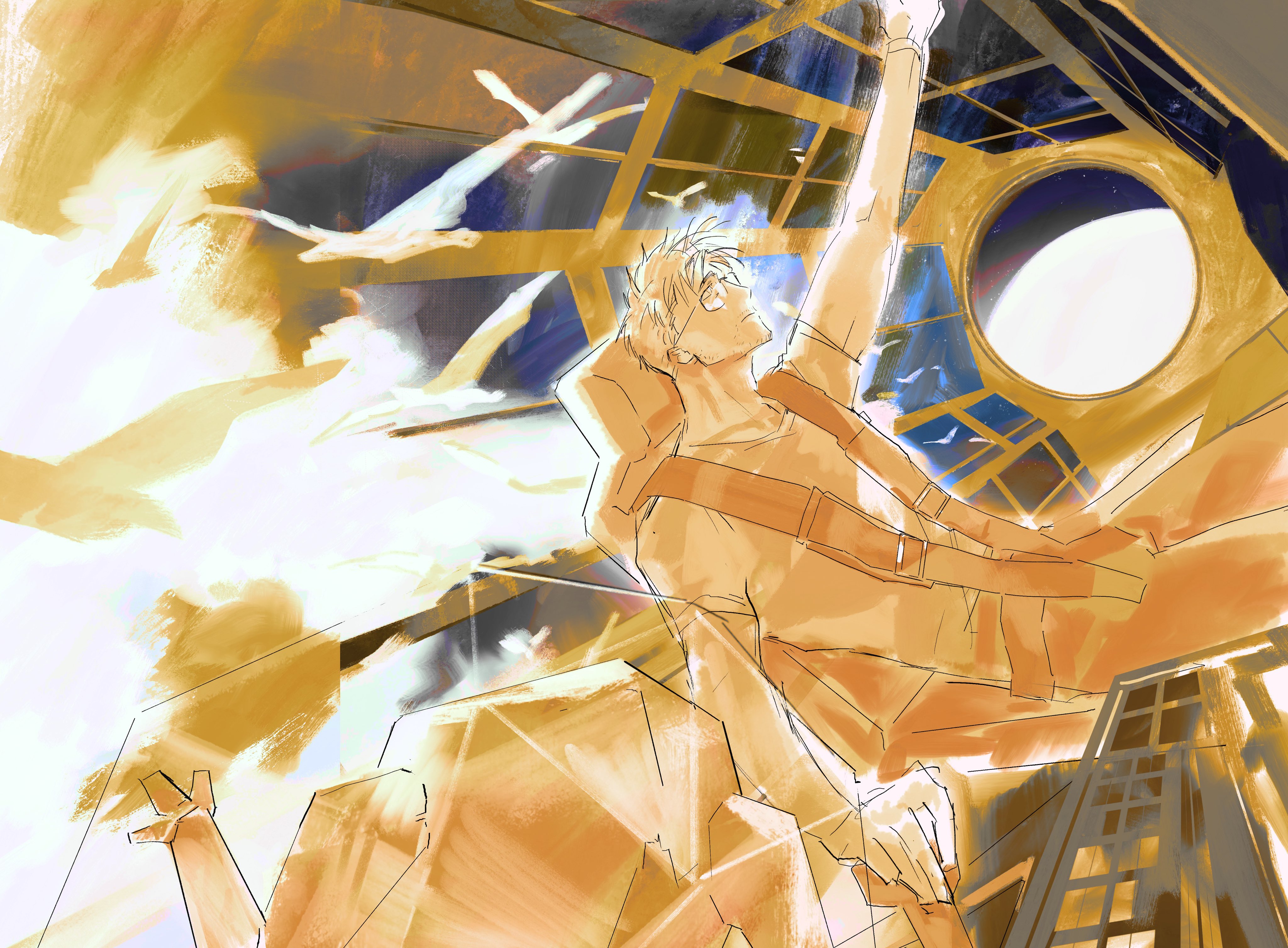 absurdres alien beard beard_stubble casual ethfinch facial_hair highres lineart male_focus messy_hair project_hail_mary rocky_(project_hail_mary) ryland_grace shirt sketch space spacecraft stubble