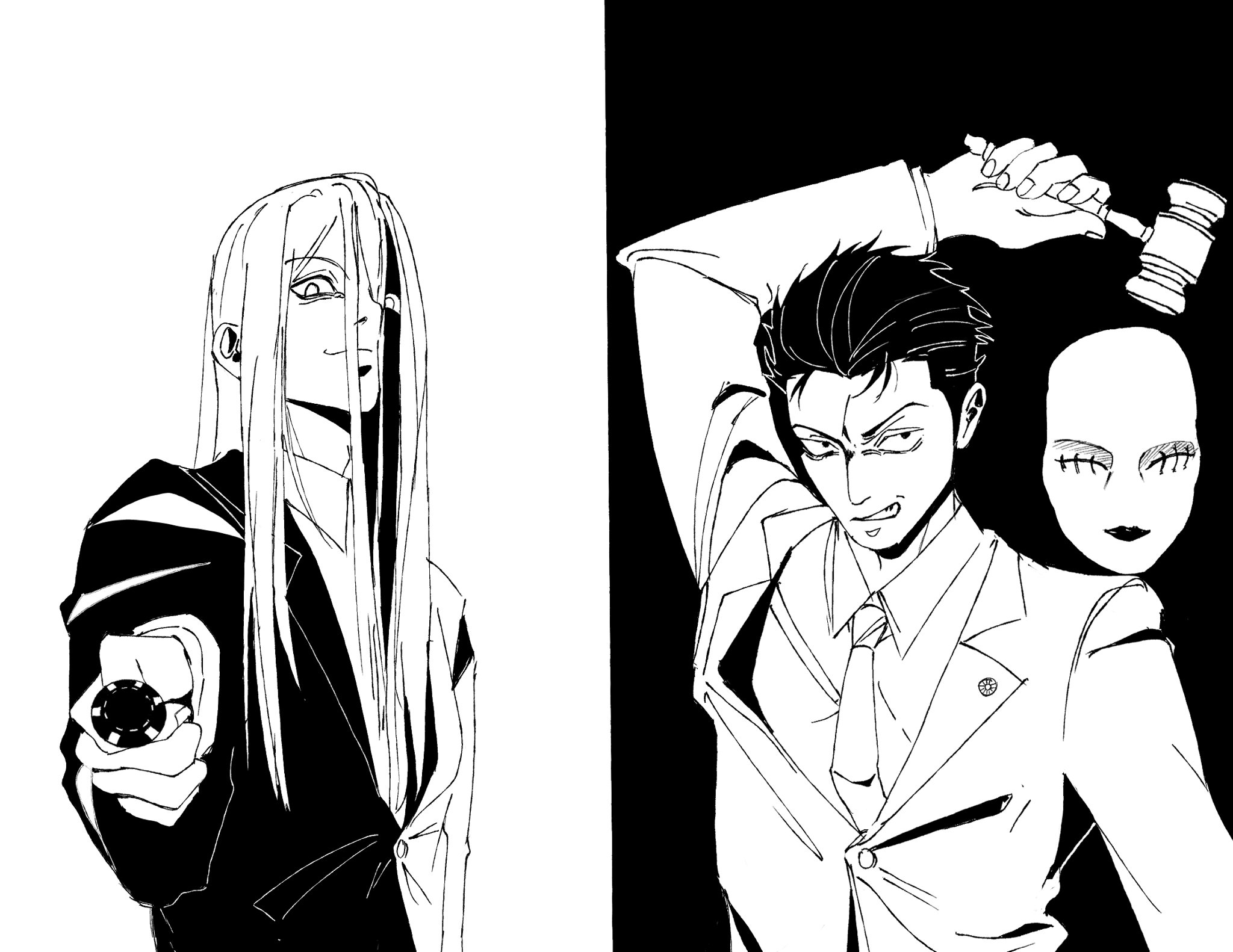 2boys absolute_batman absolute_dc contrast cosplay dc_comics formal_clothes hammer highres higuruma_hiromi higuruma_hiromi_(cosplay) holding holding_hammer jacket judge judgeman_(jujutsu_kaisen) jujutsu_kaisen multiple_boys necktie poker_chip polar_opposites split_theme suit suit_jacket two-face_(absolute_dc) vvvermw