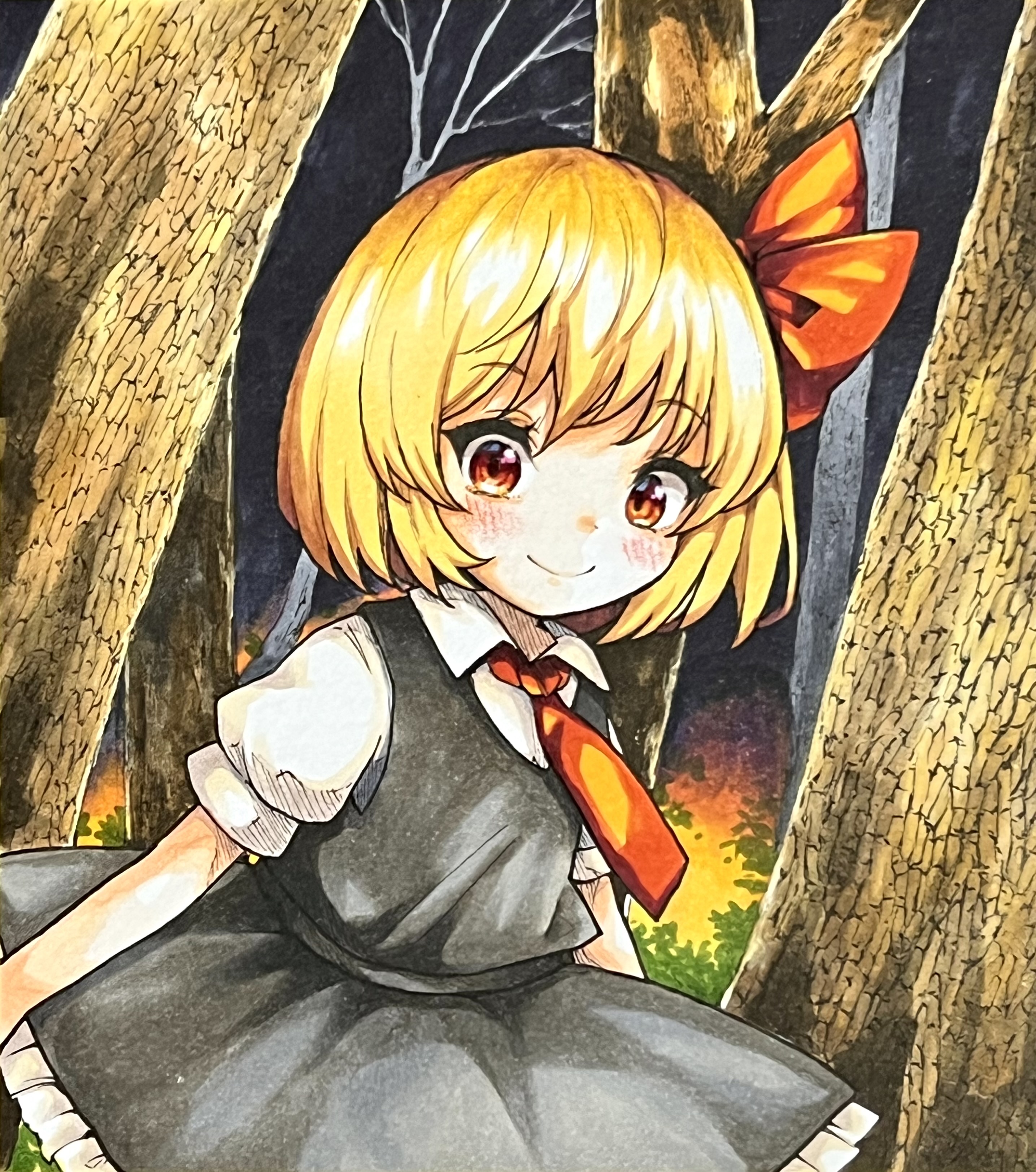 1girl absurdres ascot black_skirt black_vest blonde_hair bow commentary_request forest frilled_skirt frills hair_bow highres long_sleeves looking_at_viewer nature puffy_short_sleeves puffy_sleeves red_ascot red_bow red_eyes rumia shirt short_sleeves skirt skirt_set smile solo tatuhiro touhou traditional_media tree vest white_shirt