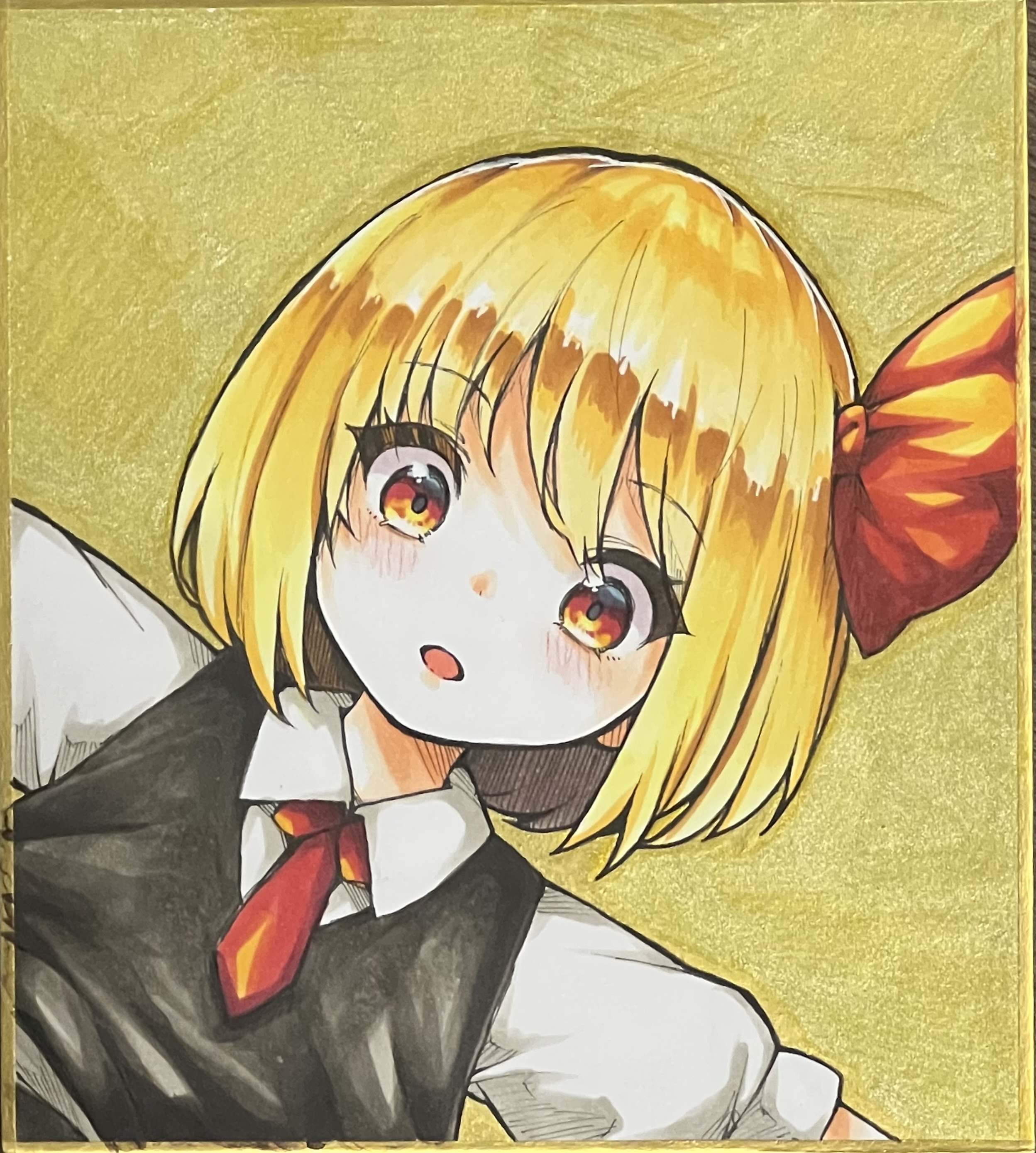 1girl absurdres ascot black_vest blonde_hair blush collared_shirt commentary_request hair_ribbon highres looking_at_viewer open_mouth red_ascot red_eyes red_ribbon ribbon rumia shirt solo tatuhiro touhou traditional_media vest white_shirt