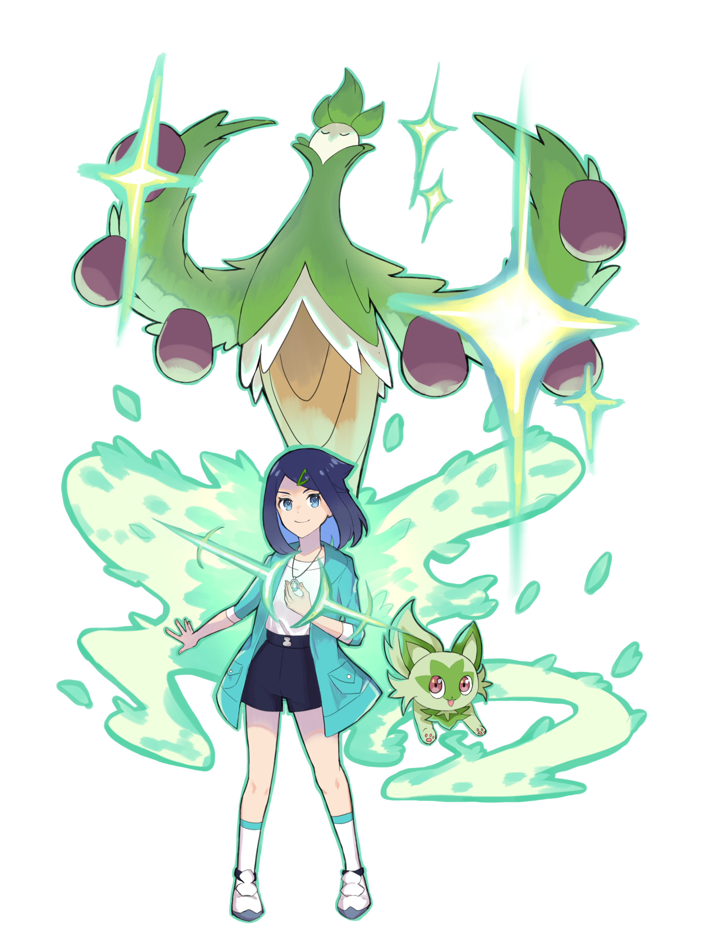 1girl :3 absurdres aqua_jacket arboliva black_hair black_shorts blue_eyes closed_eyes closed_mouth commentary eyelashes fangs full_body green_outline hair_ornament hairclip highres jacket jewelry liko_(pokemon) medium_hair necklace nintendo open_clothes open_jacket open_mouth outline pendant pink_eyes pokemon pokemon_(anime) pokemon_(creature) pokemon_horizons rairaizone shirt shoes shorts simple_background smile socks sparkle sprigatito standing white_background white_shirt white_shoes white_socks
