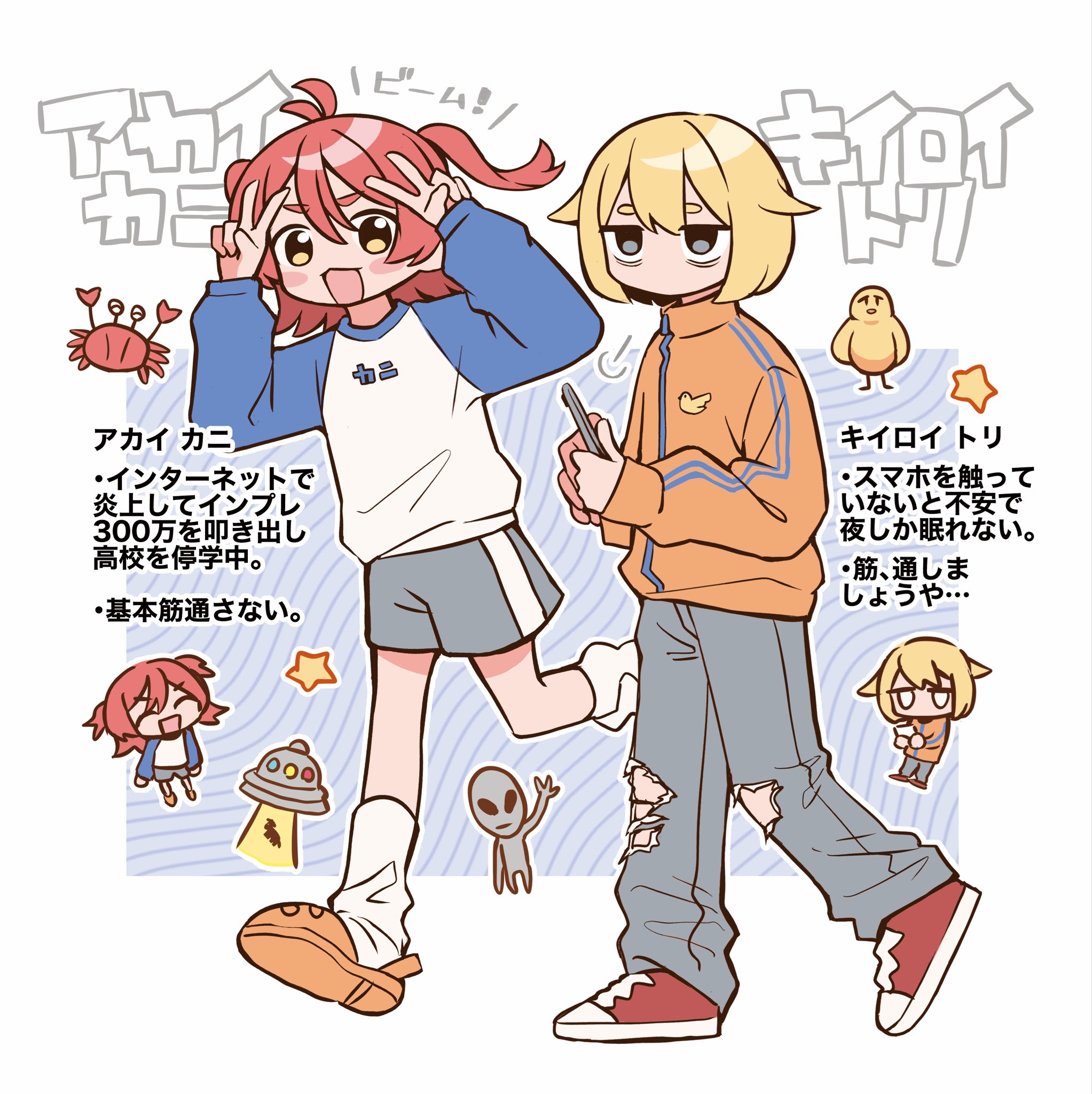 2girls akagi_natsuichi akai_kani_(akagi_natsuichi) alien antenna_hair blonde_hair blue_sleeves blush_stickers cellphone character_name commentary_request double_v full_body grey_alien grey_eyes grey_pants grey_shorts hair_ornament highres holding holding_phone jacket kiiroi_tori_(akagi_natsuichi) long_sleeves looking_at_viewer medium_hair multiple_girls orange_jacket orange_shoes original pants phone raglan_sleeves red_hair red_shoes shirt shoes short_hair shorts smartphone socks star_(symbol) star_hair_ornament torn_clothes torn_pants two_side_up ufo v white_shirt white_socks yellow_eyes