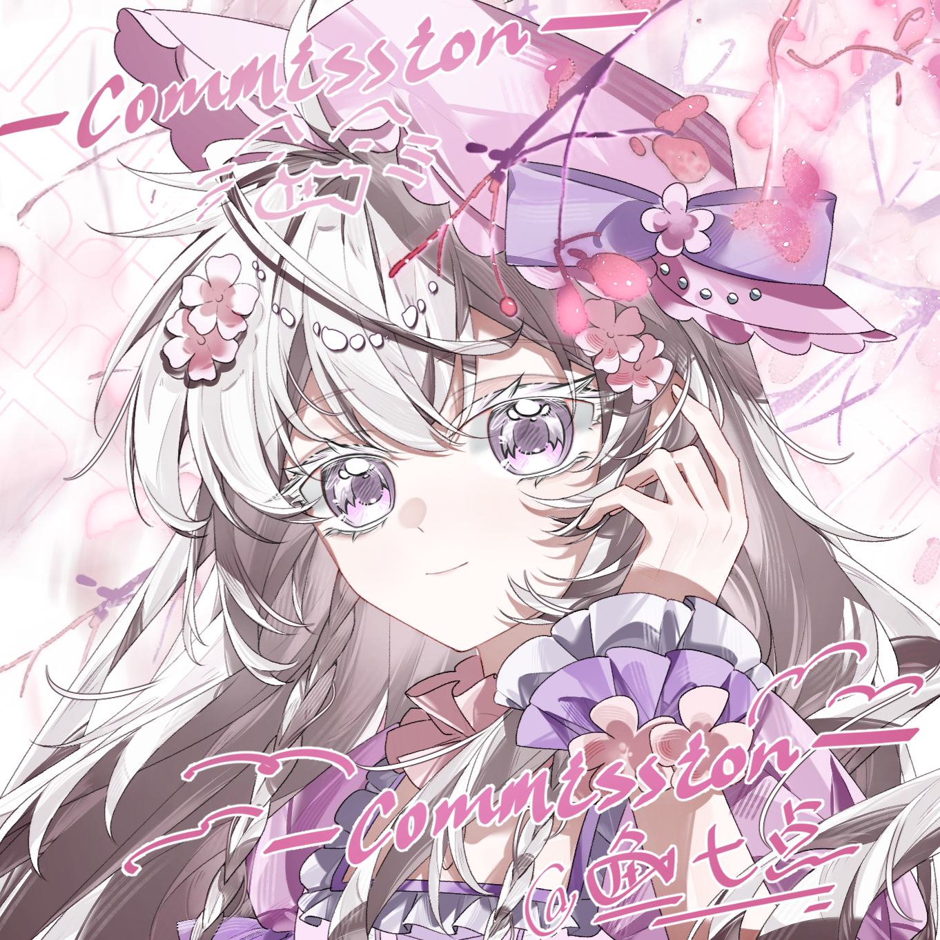 1girl ahoge bow braid cherry_blossoms closed_mouth dress flower frills grey_hair hair_flower hair_ornament hat highres long_hair looking_at_viewer multicolored_hair original pink_flower portrait purple_eyes short_sleeves smile solo upper_body white_hair wrist_cuffs yu7diandian