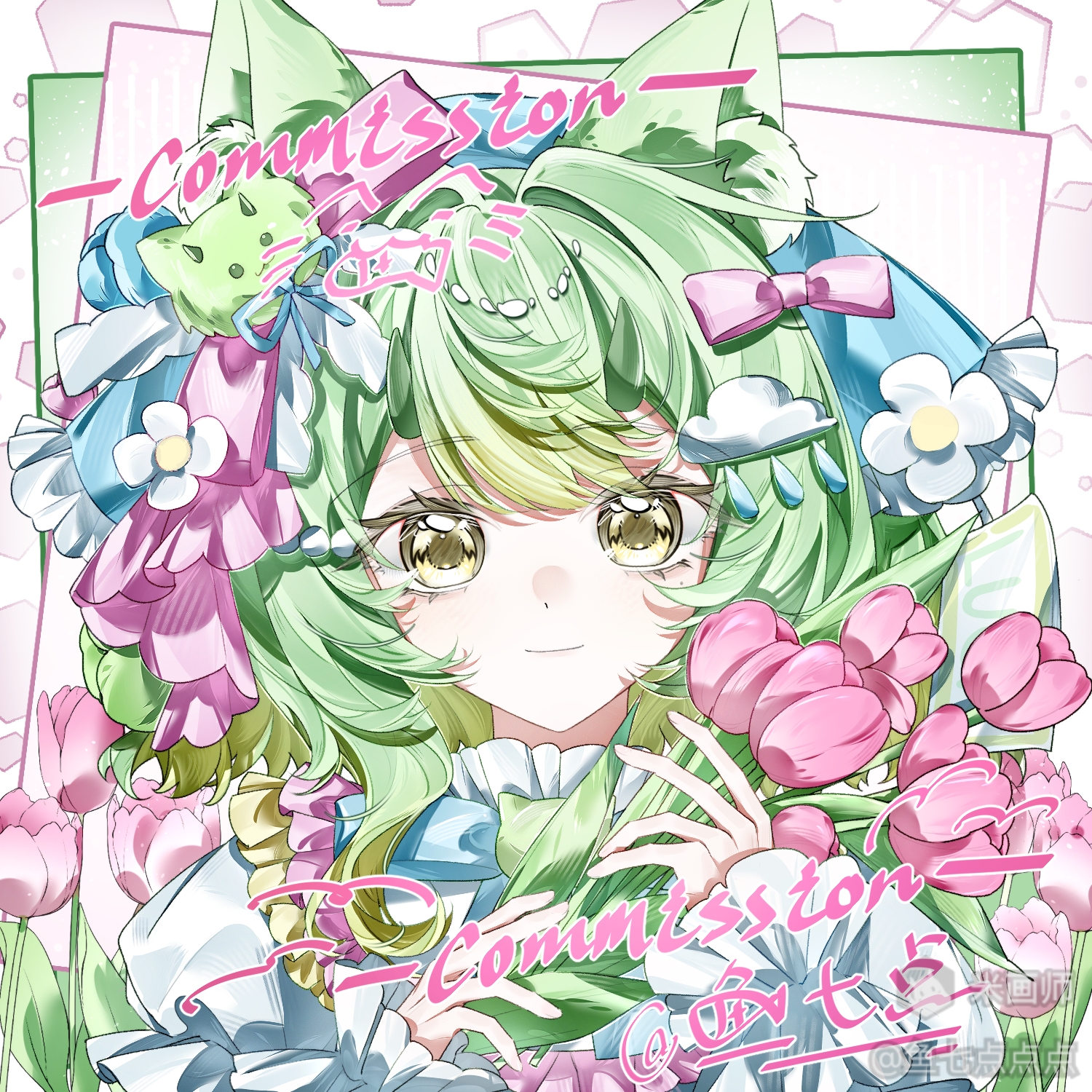 1girl animal_ear_fluff animal_ears blue_bow bouquet bow bowtie cat_ears cat_girl closed_mouth flower frilled_sleeves frills green_hair hair_bow hair_ornament highres holding holding_flower long_hair long_sleeves looking_at_viewer original pink_bow pink_flower portrait puffy_sleeves sample_watermark shirt smile solo tulip upper_body watermark white_shirt white_sleeves yellow_eyes yu7diandian
