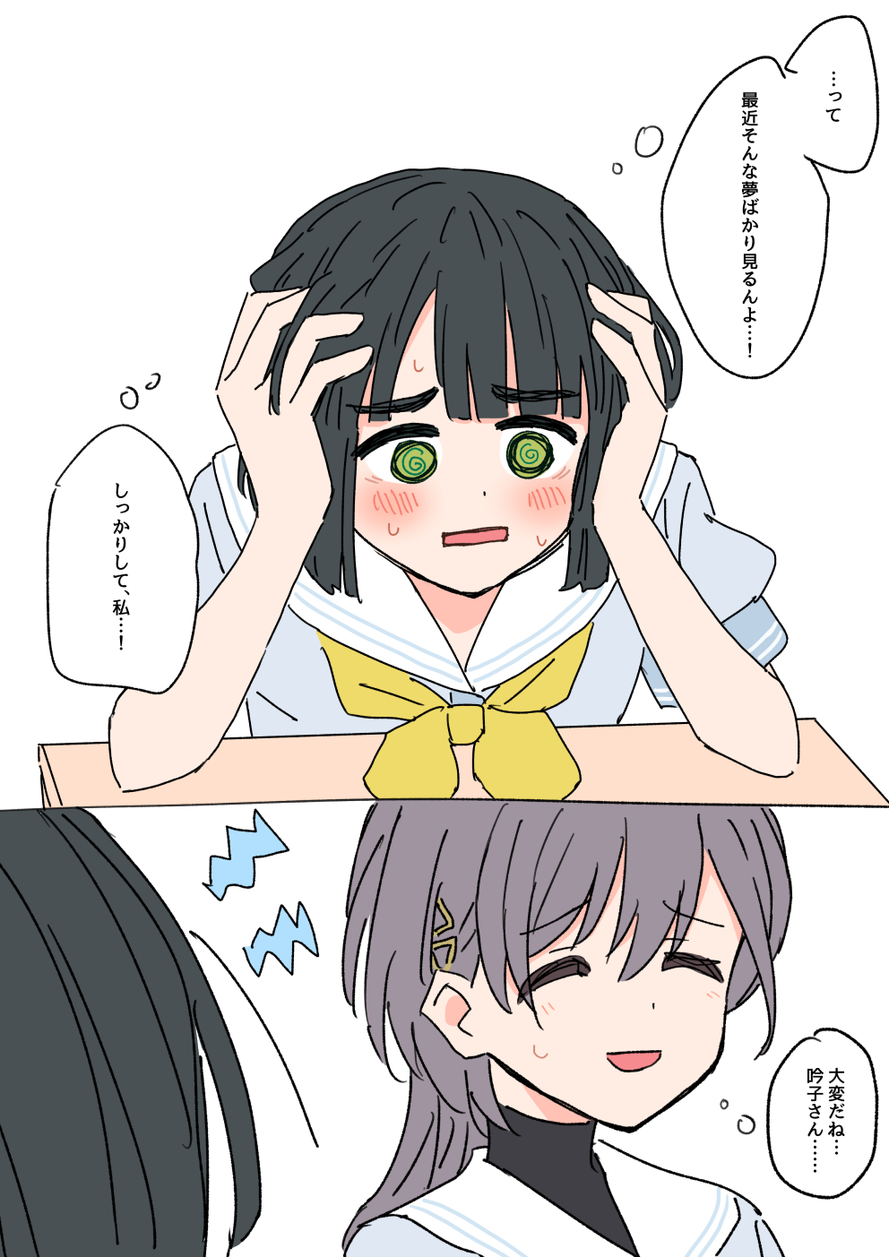 2girls @_@ black_hair blue_dress blunt_bangs blunt_ends blush bob_cut commentary_request dress grey_hair hair_ornament hands_on_own_head hasu_no_sora_school_uniform highres katsuragi_izumi link!_like!_love_live! love_live! momose_ginko multiple_girls neckerchief nervous_sweating nogreen open_mouth puffy_short_sleeves puffy_sleeves sailor_collar sailor_dress school_uniform short_hair short_sleeves shout_lines speech_bubble summer_uniform sweat thought_bubble translation_request triangle_hair_ornament virtual_youtuber white_sailor_collar yellow_neckerchief