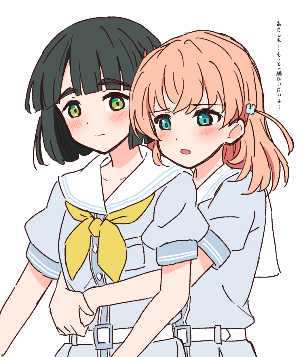 2girls aqua_eyes black_hair blue_dress blunt_bangs blunt_ends blush bob_cut cerise_bouquet collarbone commentary_request crossed_bangs dress green_eyes hair_ornament hasu_no_sora_school_uniform highres hinoshita_kaho hug hug_from_behind light_frown link!_like!_love_live! love_live! medium_hair momose_ginko multiple_girls neckerchief nogreen open_mouth orange_hair pleated_dress puffy_short_sleeves puffy_sleeves rabbit_hair_ornament sailor_collar sailor_dress school_uniform short_hair short_sleeves simple_background summer_uniform translation_request two_side_up upper_body virtual_youtuber white_background white_sailor_collar yellow_neckerchief yuri