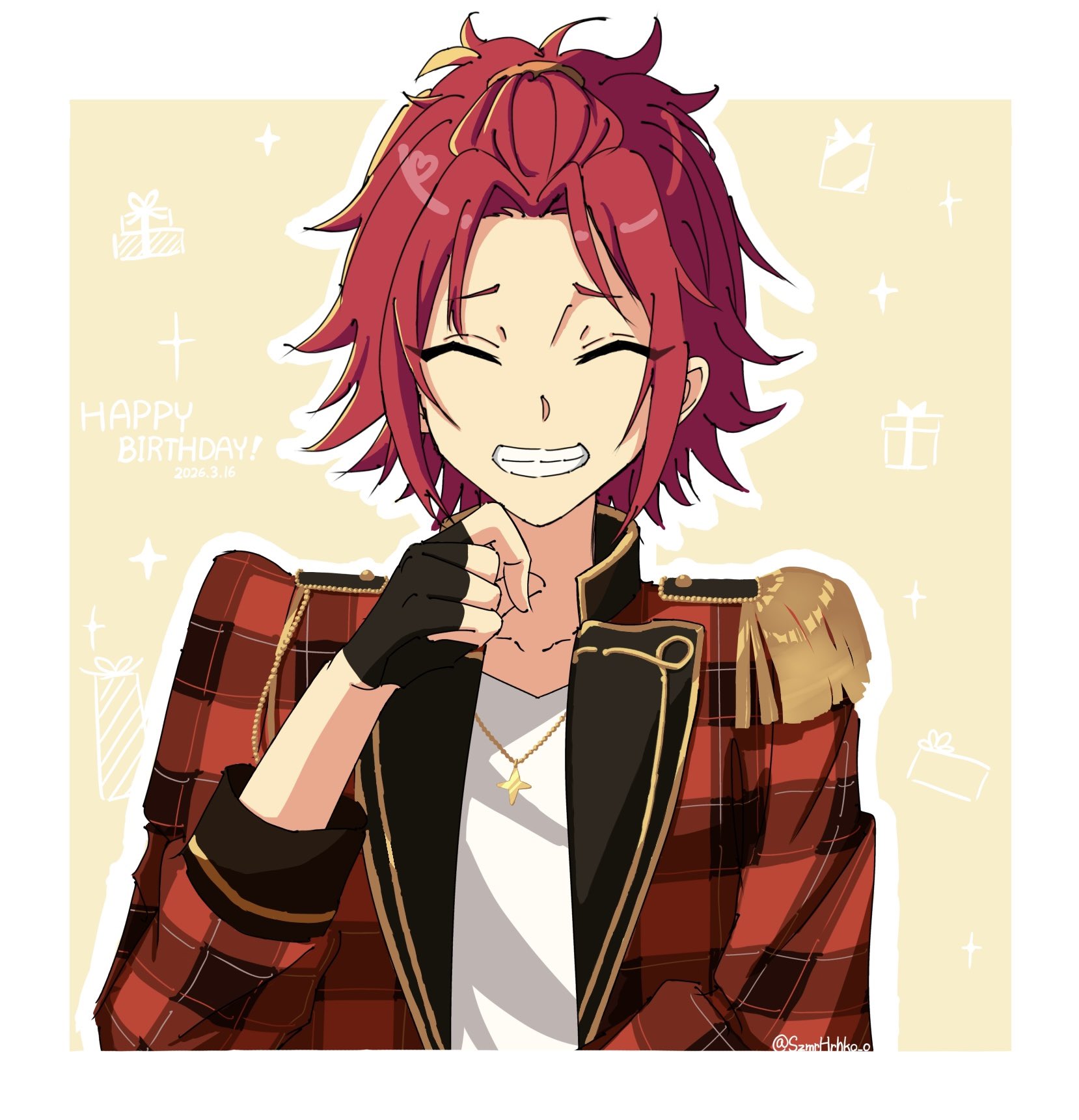 1boy bangs_pinned_back black_gloves box clenched_teeth closed_eyes commentary_request curtained_hair dated ensemble_stars! facing_viewer fingerless_gloves gift gift_box gloves hand_up happy_birthday high_collar highres isara_mao jacket jewelry layered_clothes long_sleeves male_focus necklace open_clothes open_jacket outline red_hair shirt short_hair smile solo sparkle star_(symbol) star_necklace suzumaru_(szmrhrhko_o) teeth three-quarter_sleeves upper_body white_outline white_shirt
