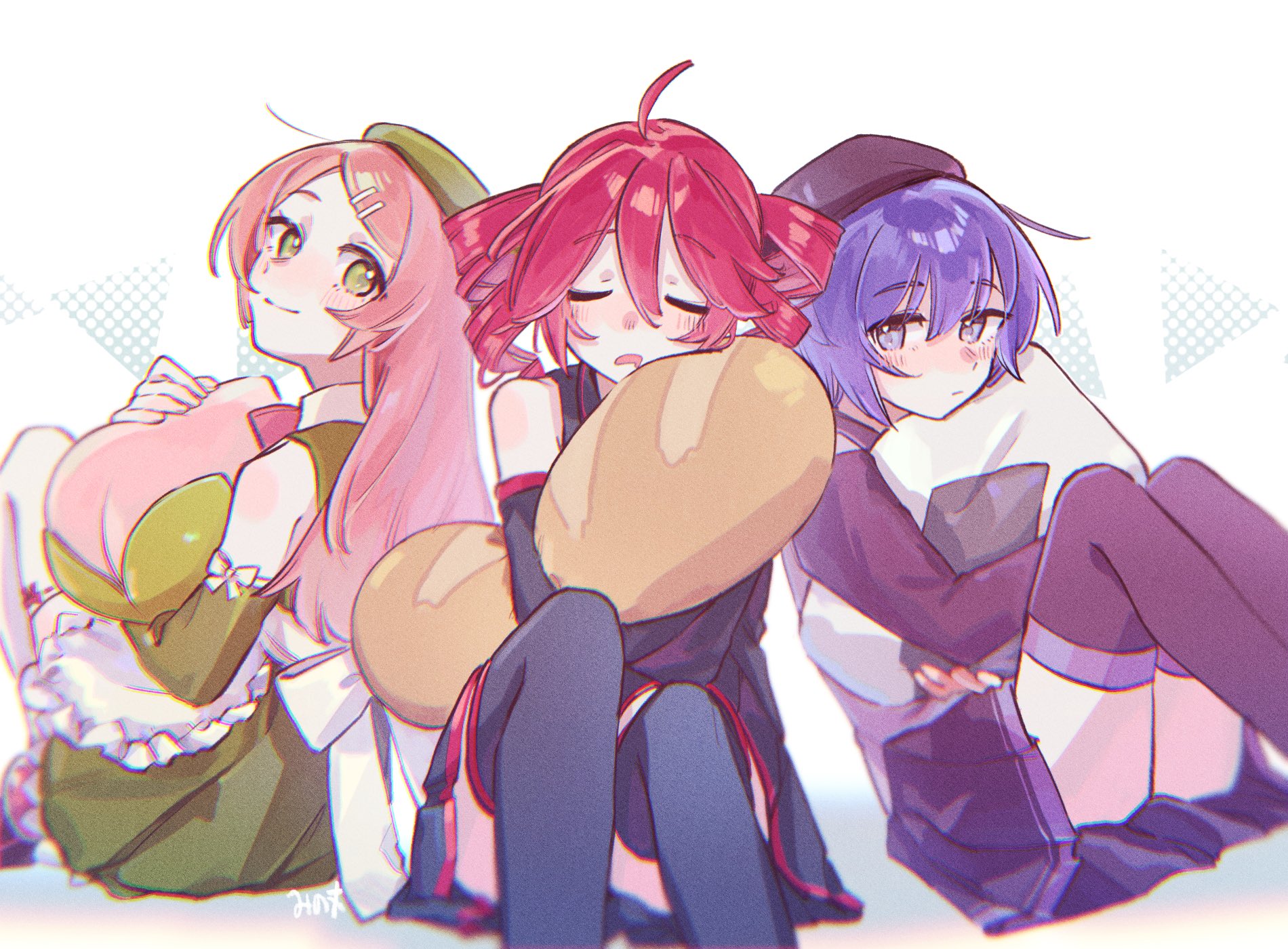 3girls ahoge apron back-to-back back_bow baguette bare_shoulders beanie black_hat black_shirt black_skirt black_sleeves black_thighhighs blush bow bow_legwear bread chromatic_aberration closed_eyes closed_mouth collared_shirt commentary_request cowlick detached_sleeves double-parted_bangs dress drill_hair drooling expressionless eyes_visible_through_hair facing_viewer feet_out_of_frame film_grain food frilled_apron frilled_dress frills full_body green_dress green_eyes green_hat green_sleeves hair_ornament hairclip hat highres holding holding_stuffed_toy hug kasane_teto kasane_teto_(utau) knees_up long_hair long_sleeves looking_at_viewer looking_back mi_no_take miniskirt momone_momo mouth_drool multiple_girls necktie nose_blush open_mouth pale_skin parallel_hairclips parted_bangs pink_hair pleated_skirt purple_eyes purple_hair purple_necktie purple_trim raised_eyebrows red_bow red_hair red_trim shirt short_dress short_hair side-by-side sideways_glance simple_background sitting skirt sleeve_bow sleeveless sleeveless_dress sleeveless_shirt smile straight-on stuffed_animal stuffed_food stuffed_toy thighhighs triangle twin_drills u_u utane_uta utau white_apron white_background white_bow white_thighhighs zettai_ryouiki