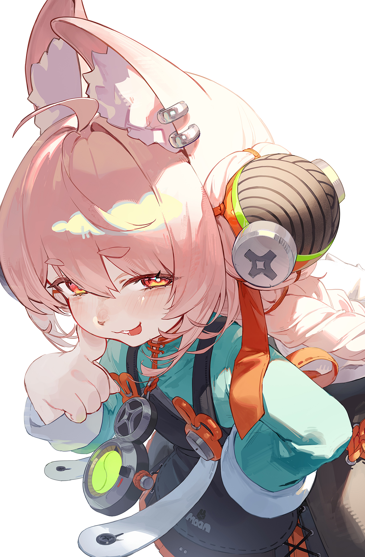 1girl ahoge animal_ear_fluff animal_ear_piercing animal_ears black_dress blush braid braided_twintails bright_pupils commentary dress english_commentary finger_to_cheek furry furry_female green_shirt hair_ornament highres kokko_(kokko3045) looking_at_viewer open_mouth pinafore_dress pink_fur rabbit_ears rabbit_girl red_eyes screw shirt short_eyebrows simple_background sleeveless sleeveless_dress solo sphere_hair_ornament thick_eyebrows upper_body white_background white_pupils zenless_zone_zero zhao_(zenless_zone_zero)