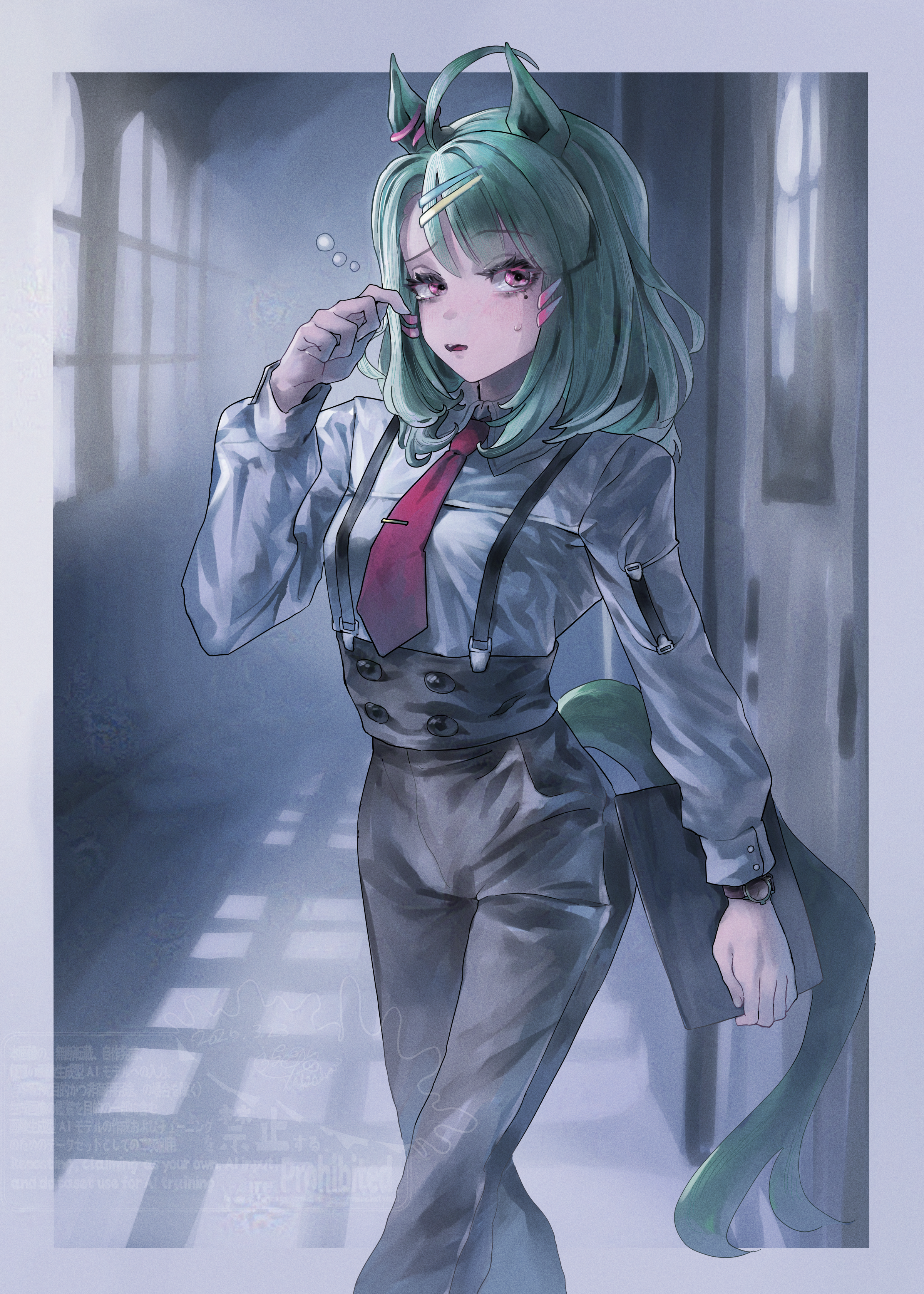 &{ID:13710926 CreatedAt:Mon Mar 23 06:15:51 -0500 2026 Score:0 Width:2400 Height:3360 MD5:2f521575de2eed2955137ccd713e7a0e Directory:2f/52 Image:2f521575de2eed2955137ccd713e7a0e.png Rating:general Source:https://www.pixiv.net/artworks/142650236 Change:1774264552 Owner:danbooru CreatorID:6498 ParentID:0 Sample:1 PreviewHeight:350 PreviewWidth:250 Tags:1girl absurdres ahoge animal_ears aqua_hair black_pants blush collared_shirt commentary_request earclip hair_ornament hairclip highres holding horse_ears horse_girl horse_tail long_sleeves looking_at_viewer medium_hair mole mole_under_eye necktie open_mouth pants purple_eyes red_necktie rinka_(tonariuta) shirt squeans sugar_lights_(umamusume) suspenders tail tie_clip umamusume watch white_shirt wristwatch Title: HasNotes:false HasComments:false FileURL:https://img2.gelbooru.com/images/2f/52/2f521575de2eed2955137ccd713e7a0e.png PreviewURL:https://gelbooru.com/thumbnails/2f/52/thumbnail_2f521575de2eed2955137ccd713e7a0e.jpg SampleURL:https://img2.gelbooru.com/samples/2f/52/sample_2f521575de2eed2955137ccd713e7a0e.jpg SampleHeight:1190 SampleWidth:850 Status:active PostLocked:0 HasChildren:false IsVideo:false DisplayDate:23.03.2026 06:15}