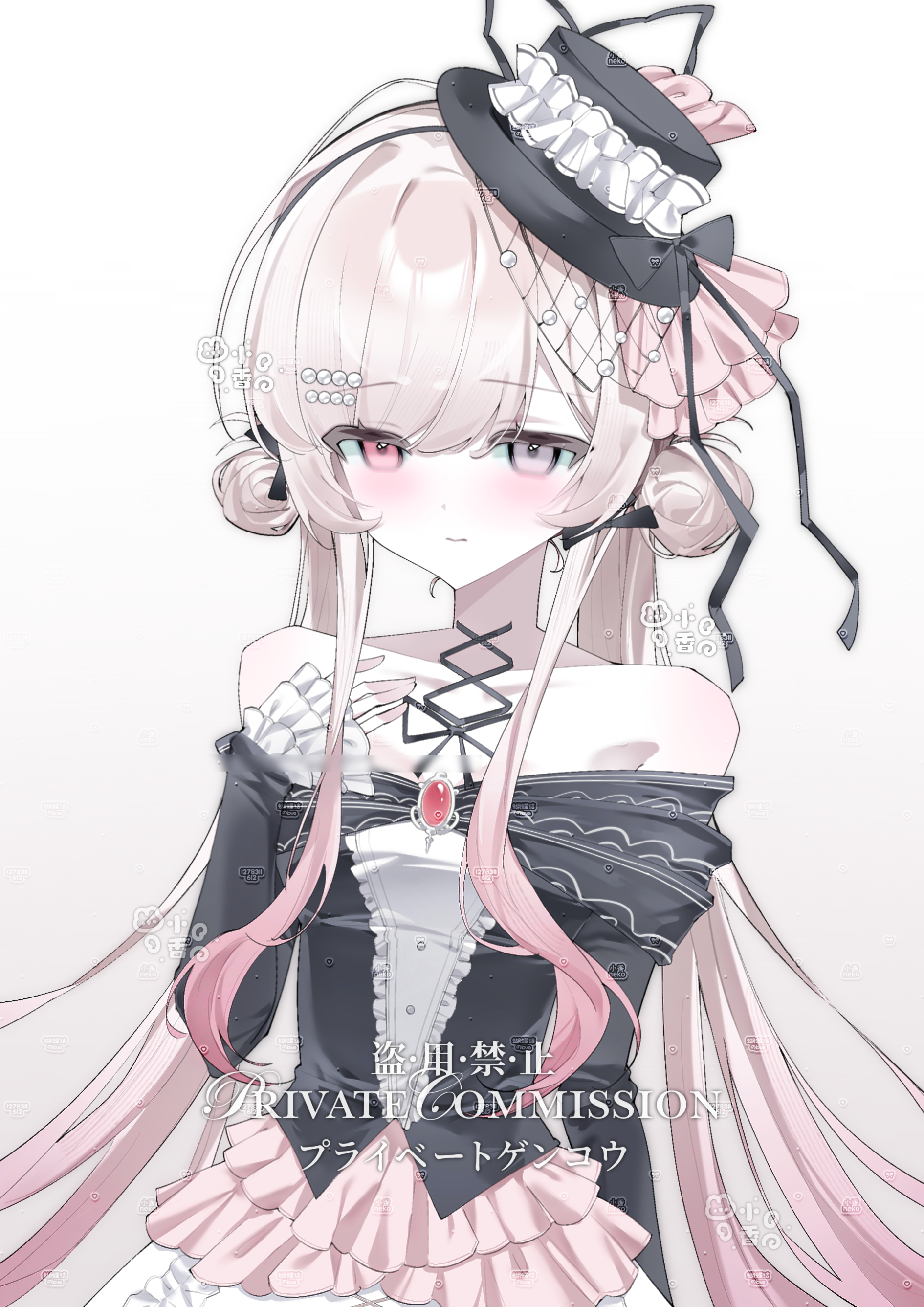 1girl absurdres bare_shoulders blush closed_mouth collarbone double_bun dress frills gradient_hair hair_bun hair_ornament hat heterochromia highres lolita_fashion long_hair long_sleeves looking_at_viewer multicolored_hair off-shoulder_dress off_shoulder original pink_eyes pink_hair ribbon shirt sidelocks solo twintails very_long_hair watermark white_background xiaoxianneko