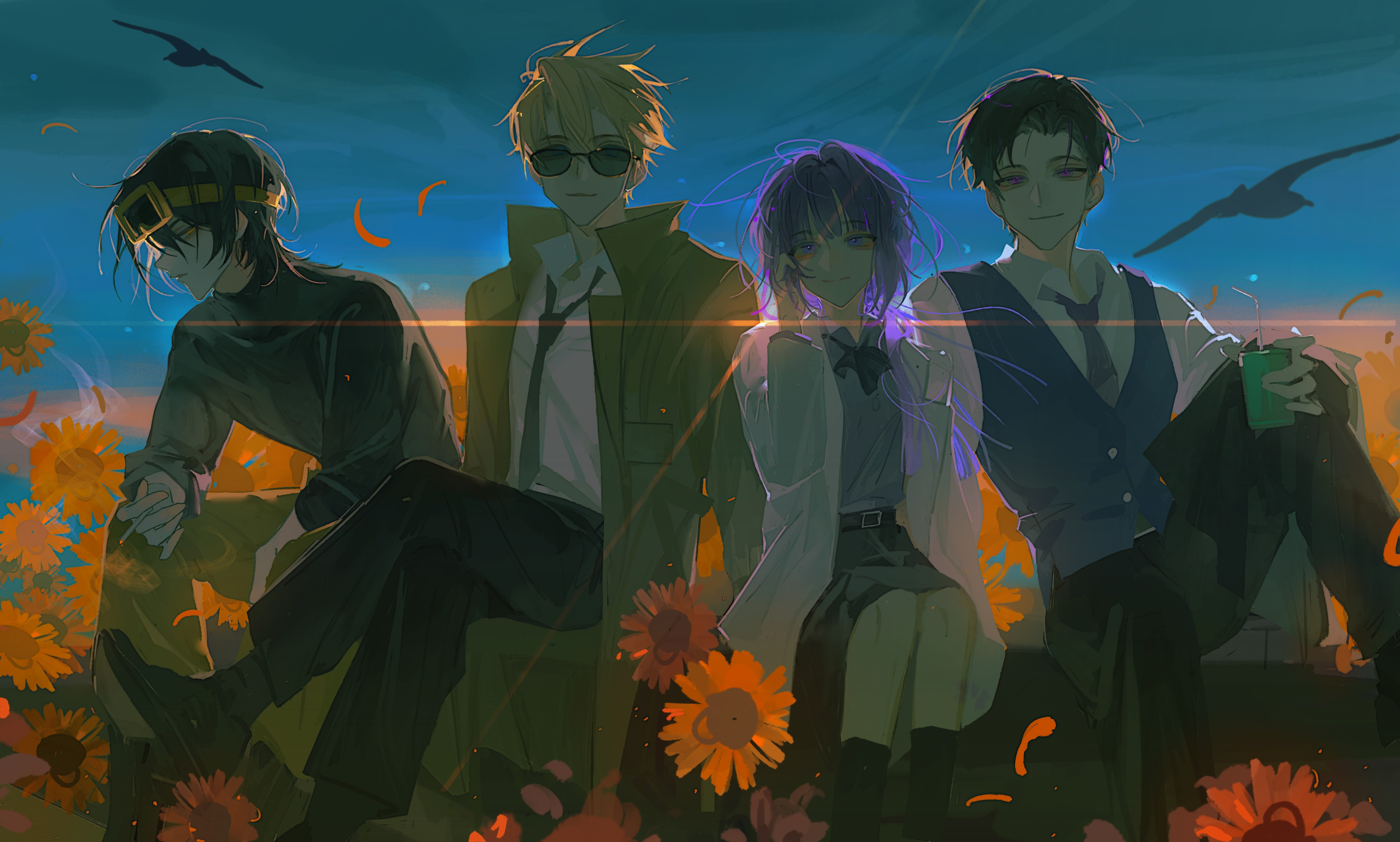 16personalities 1girl 3boys absurdres adjusting_eyewear blonde_hair blue_sky blunt_bangs can chinese_commentary coat collared_coat collared_shirt commentary_request crossed_legs cup debater_(16personalities) disposable_cup drink_can echo_bushi_tian_gou entrepeneur_(16personalities) flower from_side glasses glint goggles goggles_on_head hair_between_eyes hair_slicked_back head_tilt high_collar high_ponytail highres holding holding_can lab_coat leaning_forward leaning_to_the_side logician_(16personalities) long_sleeves looking_at_viewer looking_down multiple_boys myers-briggs_type_indicator necktie on_bench outdoors pants ponytail purple_eyes purple_hair shirt sitting skirt sky soda_can sunflower sunglasses sunset vest virtuoso_(16personalities) white_coat