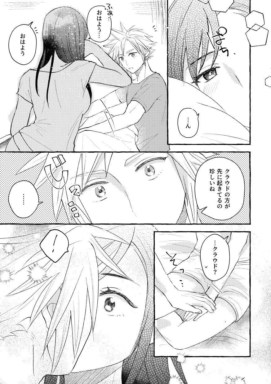 ! ... 1boy 1girl bed_sheet black_hair cloud_strife commentary couple final_fantasy final_fantasy_vii final_fantasy_vii:_advent_children greyscale hetero highres kiss light_particles long_hair looking_at_another monochrome motion_lines notice_lines shirt short_hair short_sleeves shorts sitting sleepwear speech_bubble spiked_hair spoken_ellipsis spoken_exclamation_mark surprise_kiss surprised tifa_lockhart translated under_covers wa38ma waking_up