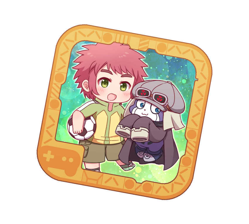 1boy appmon appmon_chip ball black_socks blush commentary_request digimon digimon_universe:_appli_monsters goggles goggles_on_headwear green_eyes green_jacket hat jacket long_sleeves lulu_hane offmon open_mouth oversized_clothes ozora_yujin red_hair shorts simple_background smile soccer_ball socks white_background