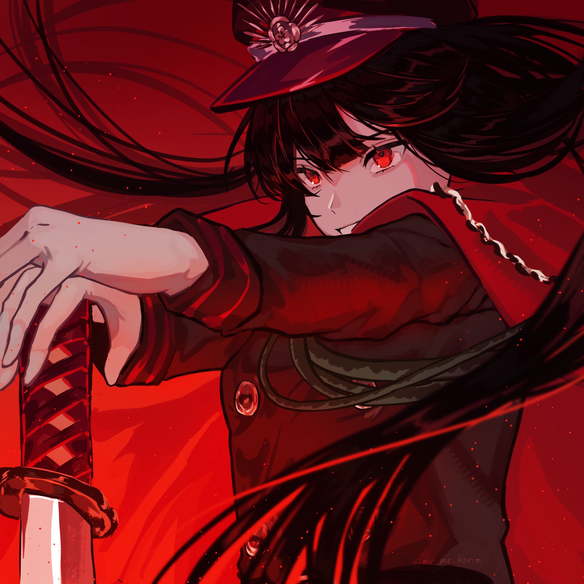 1girl black_hair black_hat black_jacket cape chain commentary_request crest family_crest fate/grand_order fate_(series) gloves gold_buttons gold_chain hat highres jacket katana long_hair me_me_korin medallion military_hat oda_nobunaga_(fate) oda_uri peaked_cap red_cape red_eyes red_theme solo sword unsheathed weapon white_gloves